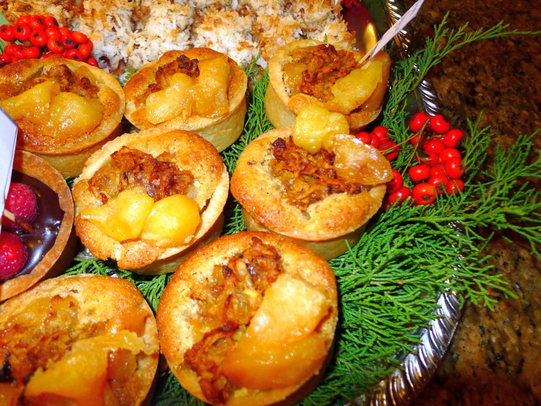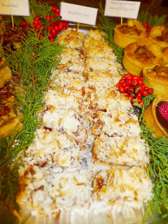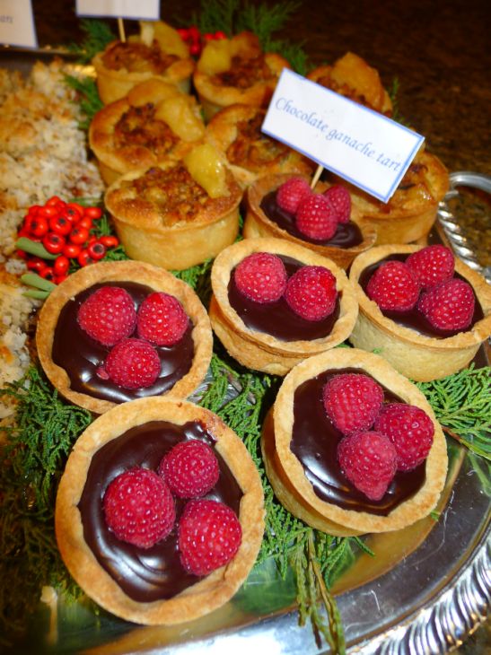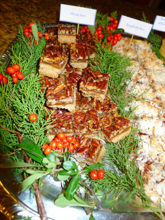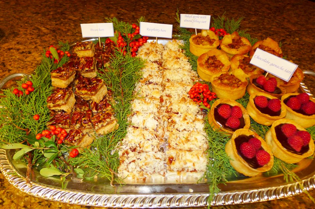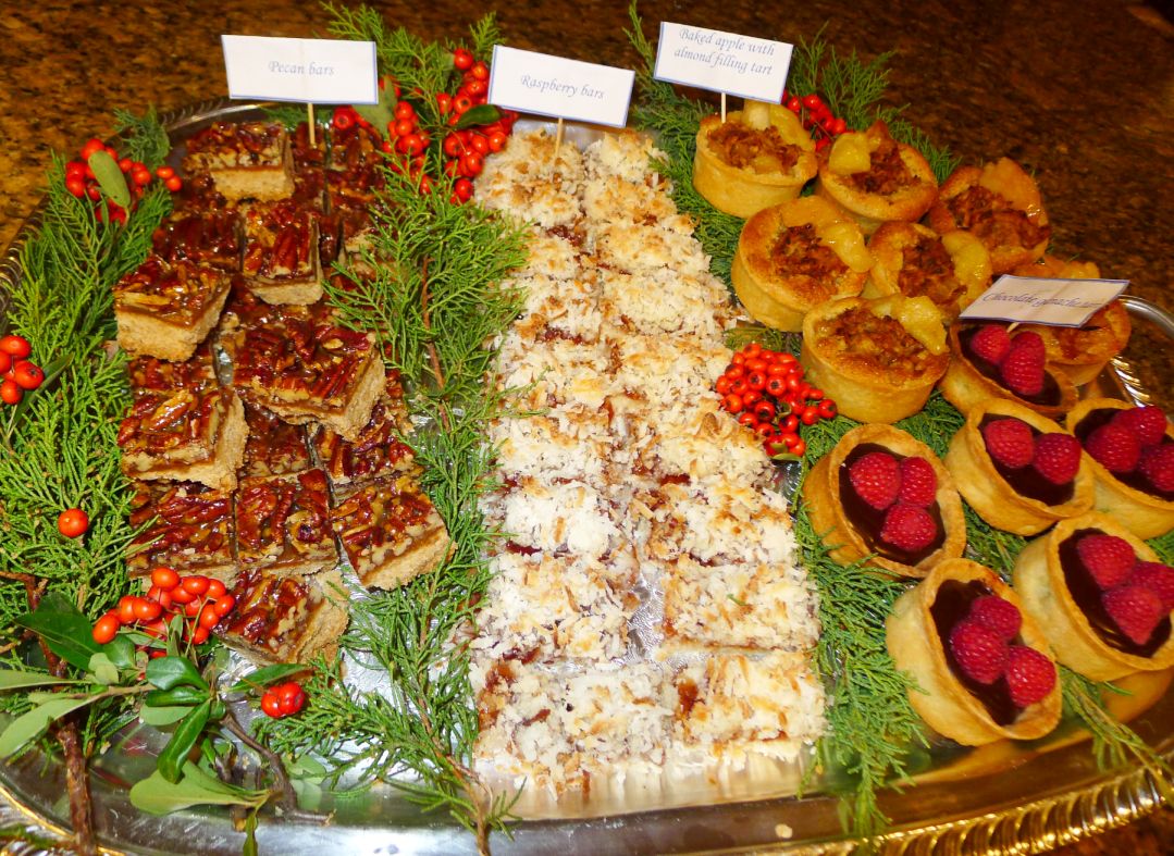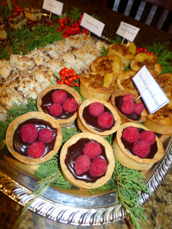 Pecan bars, Raspberry bars, Baked apple tartlets, and chocolate ganache tartletst.
