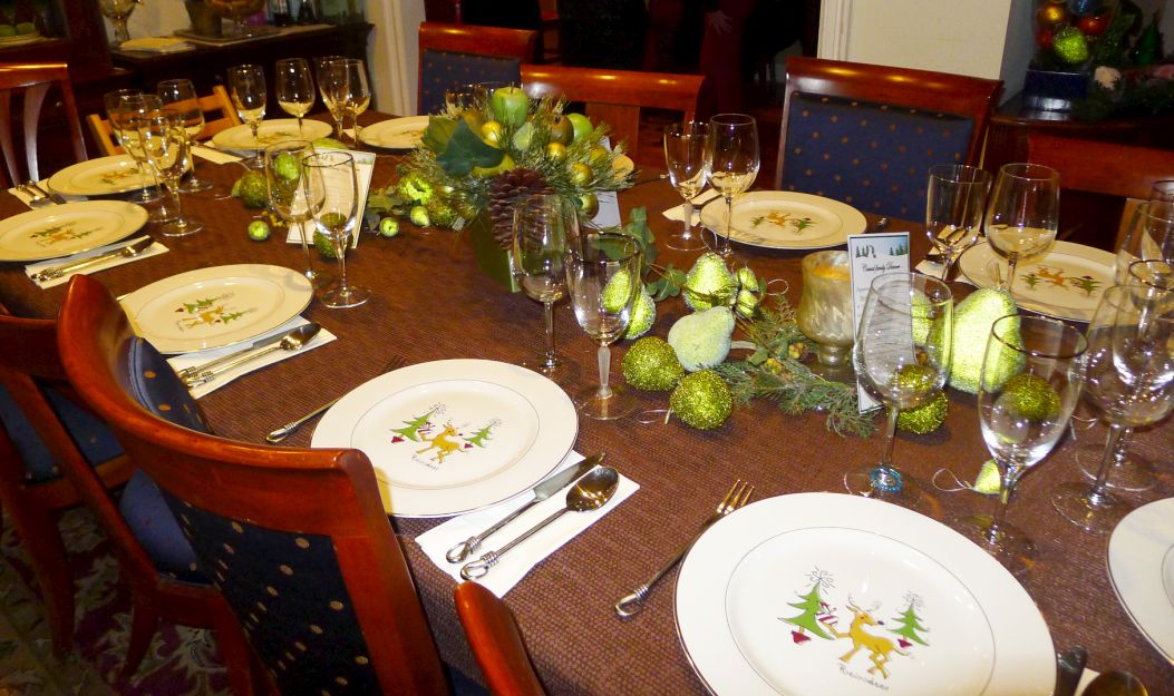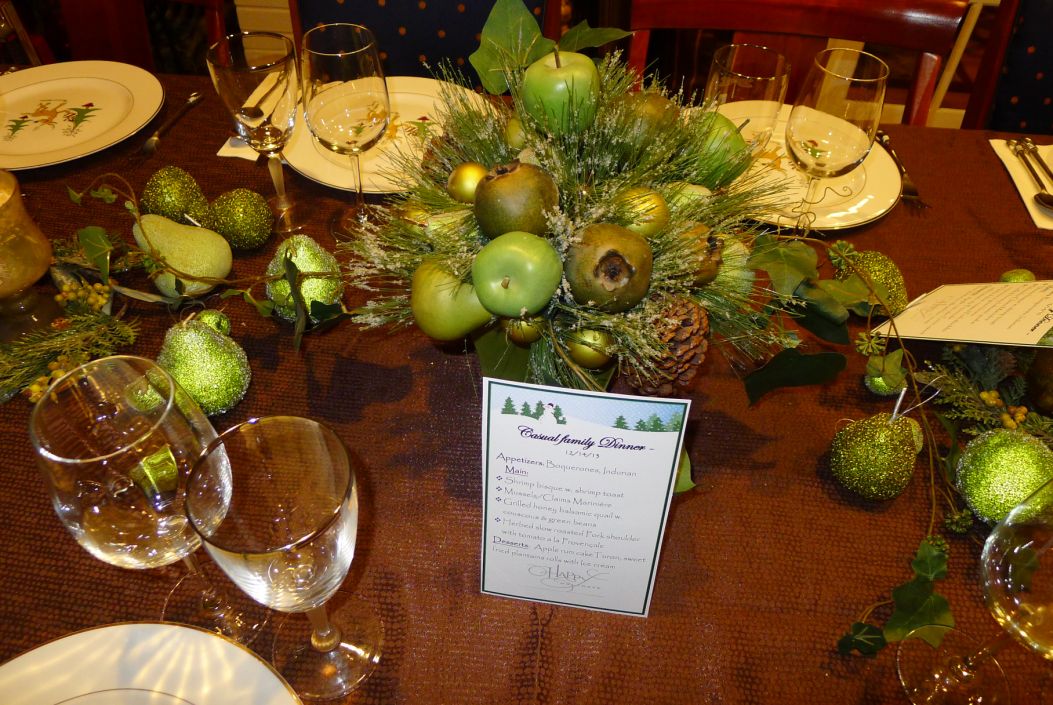 A centerpiece made with pine cones, green apples, festive ornaments, and pine branches brings out the holiday spirit.