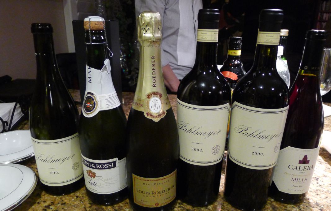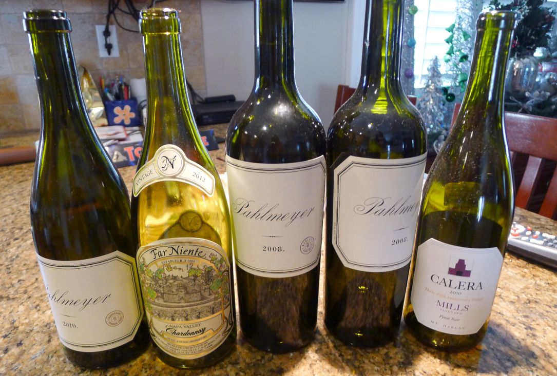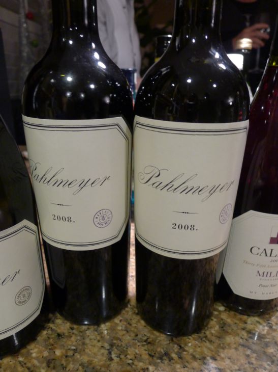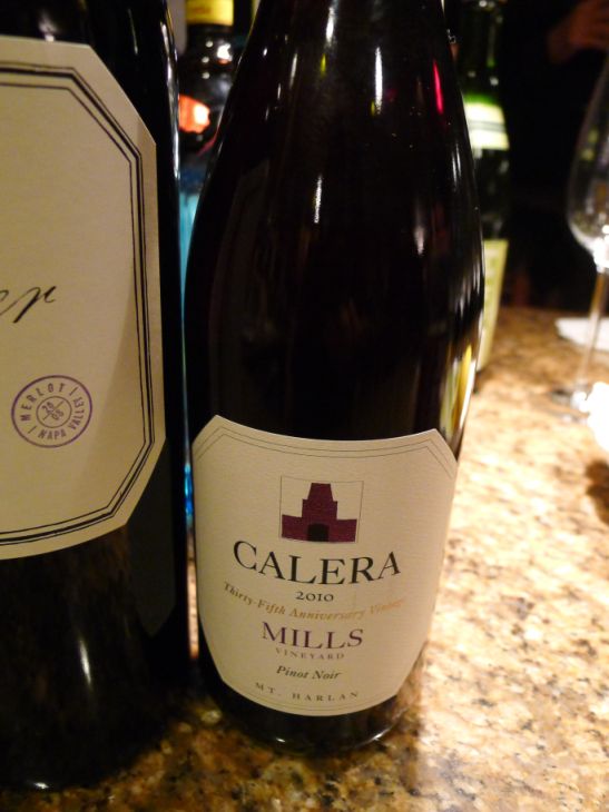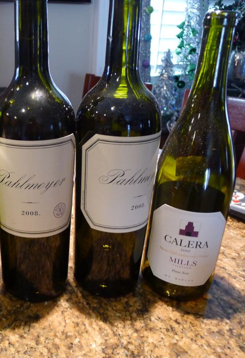 Red Wine: 2 bottles of Pahlmeyer Napa Vlley Merlot 2008 and a bottle of Calera 2010 Mi8lls vineyard Pinot noir |