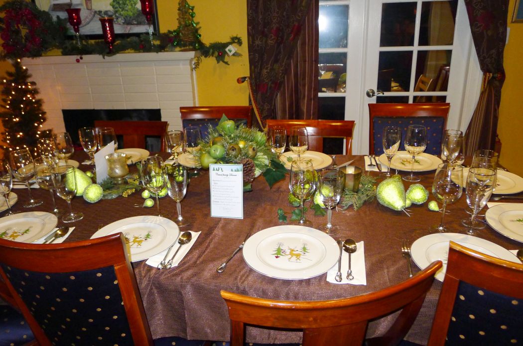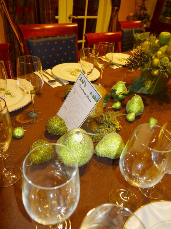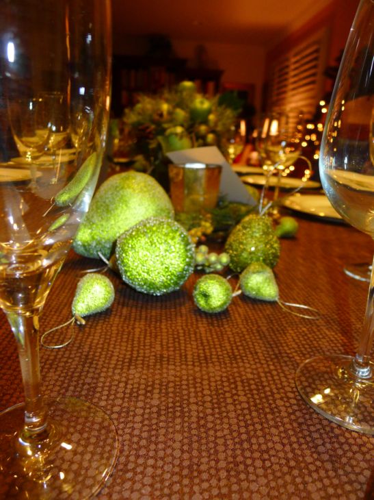 I choose a brown table cloth and decorate the table with a variety of pears ornaments, added some silver candlelight holders to complete the look.