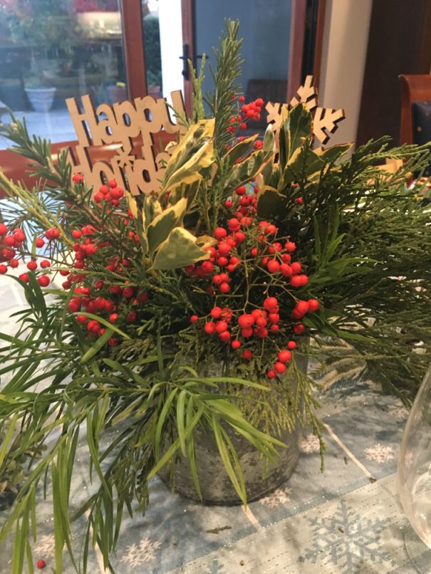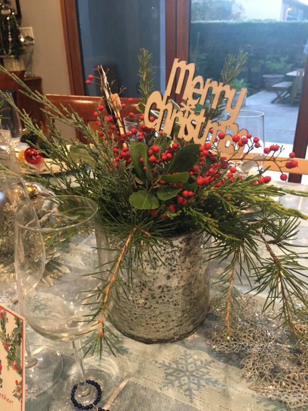 I created 3 Christmas centerpieces with the use of silver vases and filled them with a variety of pine branches and added some red berries.