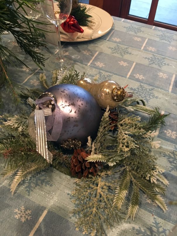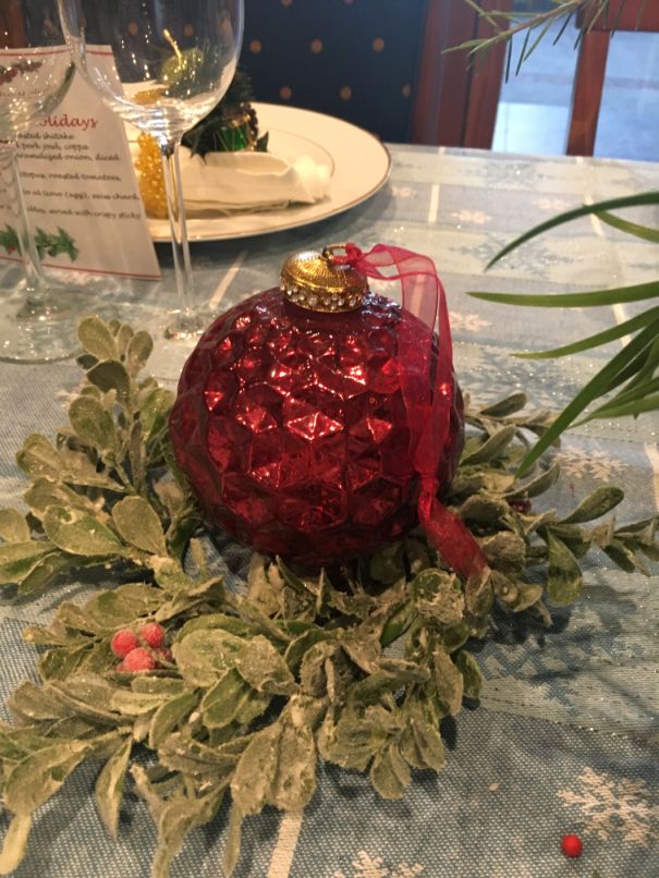 I tried to make each plate setting as festive as possible by using colorful ornaments.
