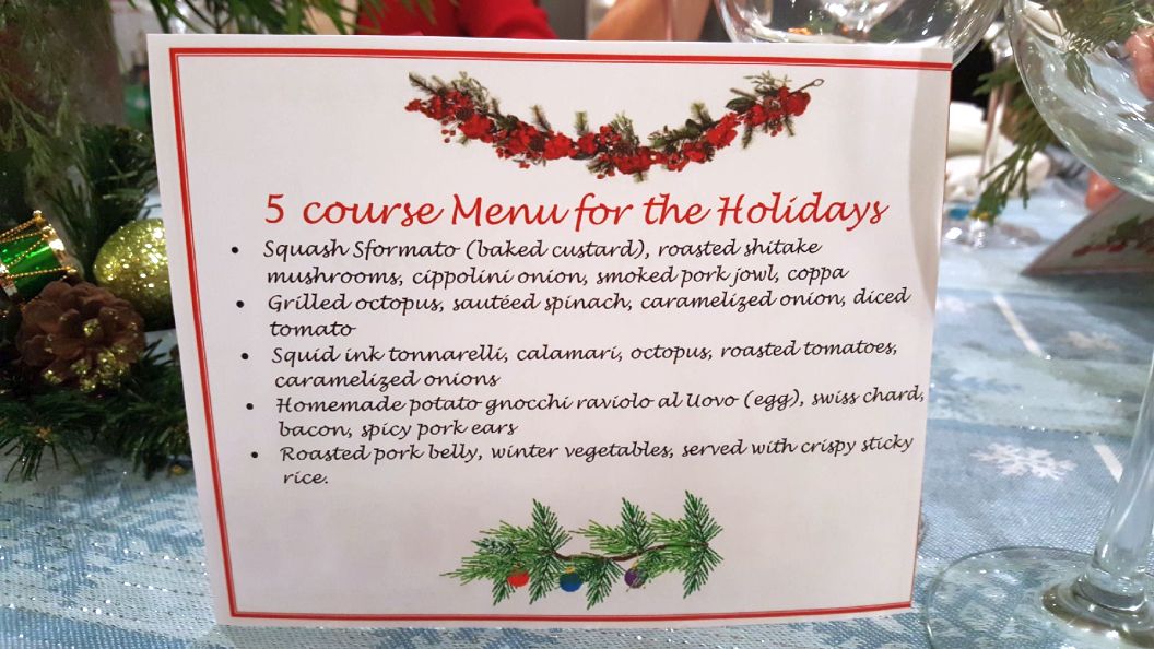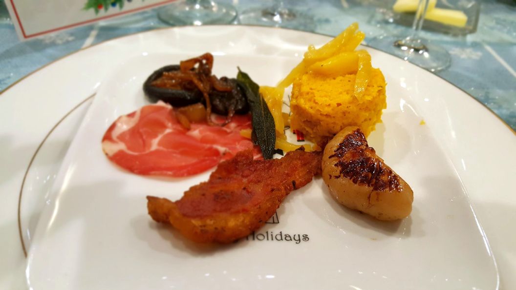 Course #1-Acorn Squash Sformato, roasted shitake mushrooms, caramelized cippolini onion, crispy smoked pork jowl, and Coppa.