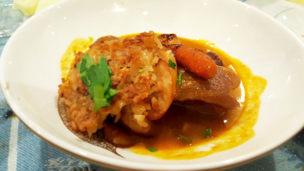 Course #5: braised pork belly in red wine, winter vegetables served with crispy sticky rice cake.