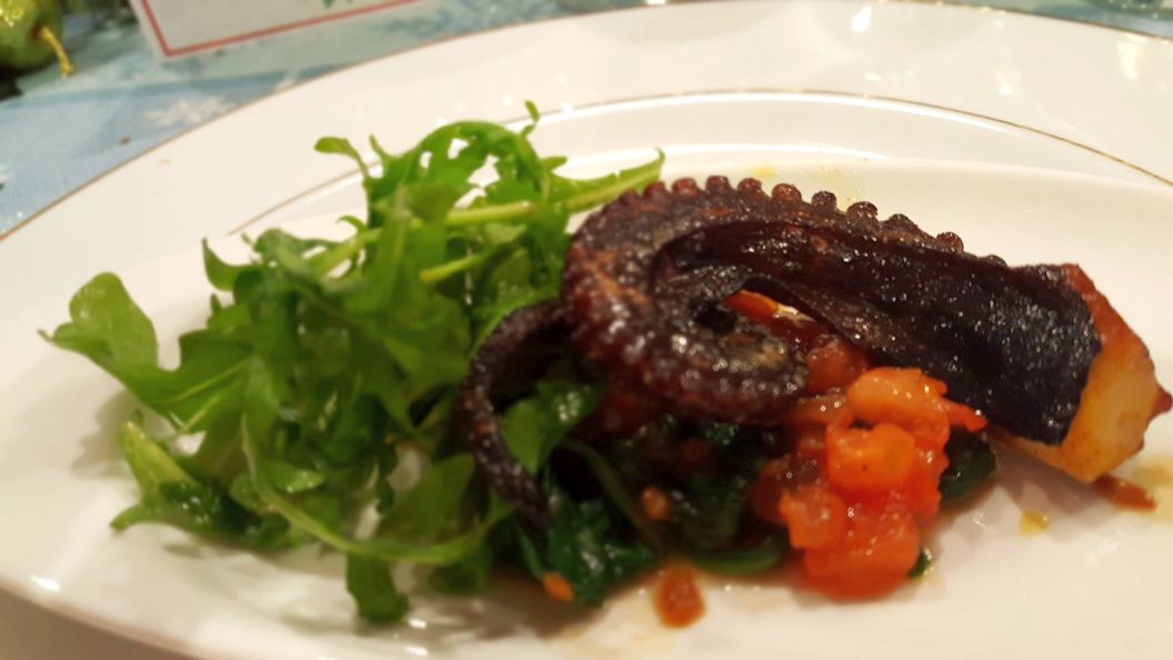 Course #2 - Grilled octopus, sautéed spinach & fresh diced tomatoes, caramelized onion.