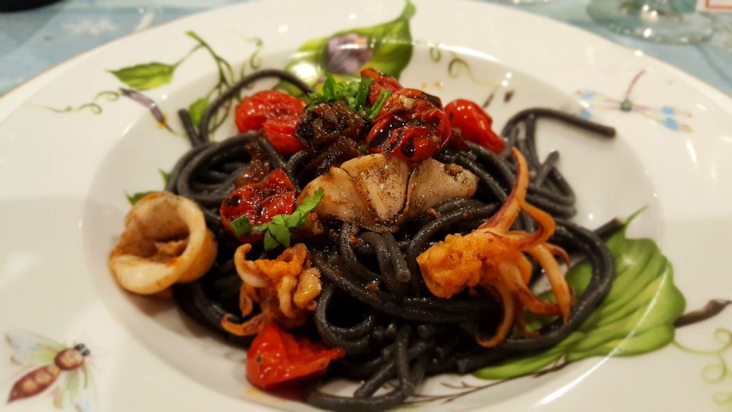 Course #3: Squid ink tonnarelli, grilled octopus, sautéed calamari, roasted baby tomatoes, caramelized onion