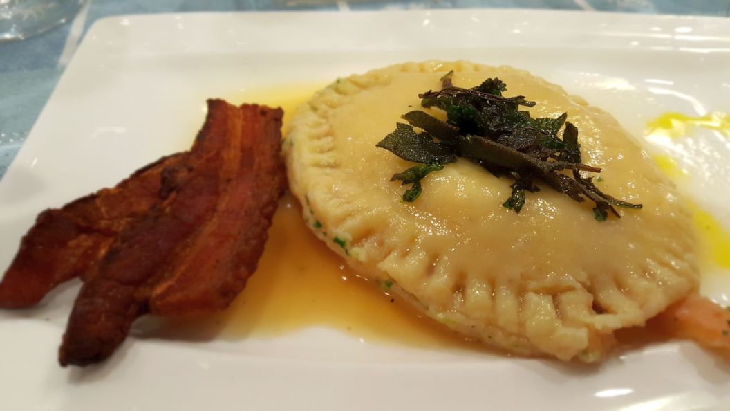 Course #4: Homemade potato gnocchi raviolo al Uovo (egg), Swiss chard & ricotta filling, crispy smoked bacon, crispy sage leave.