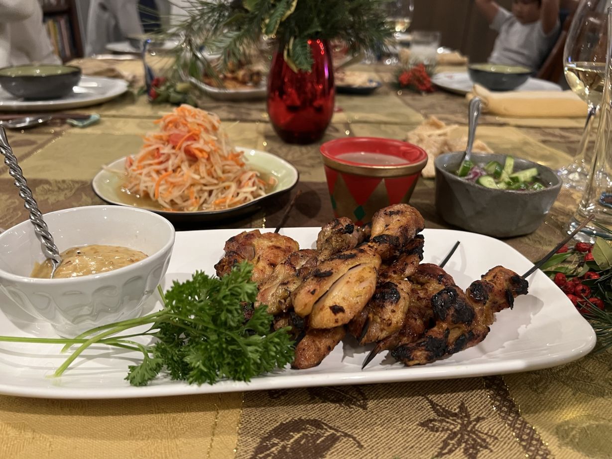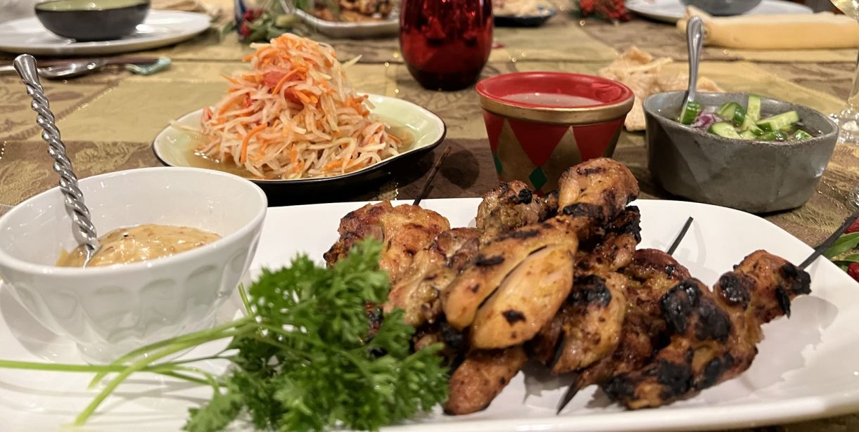 Chicken sate with peanut butter sauce and Tom mak hoong (Papaya Salad) in the back and cucumber salad.