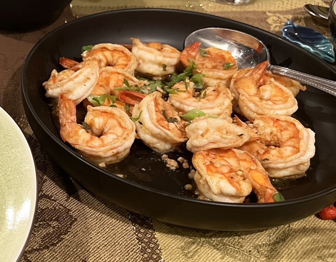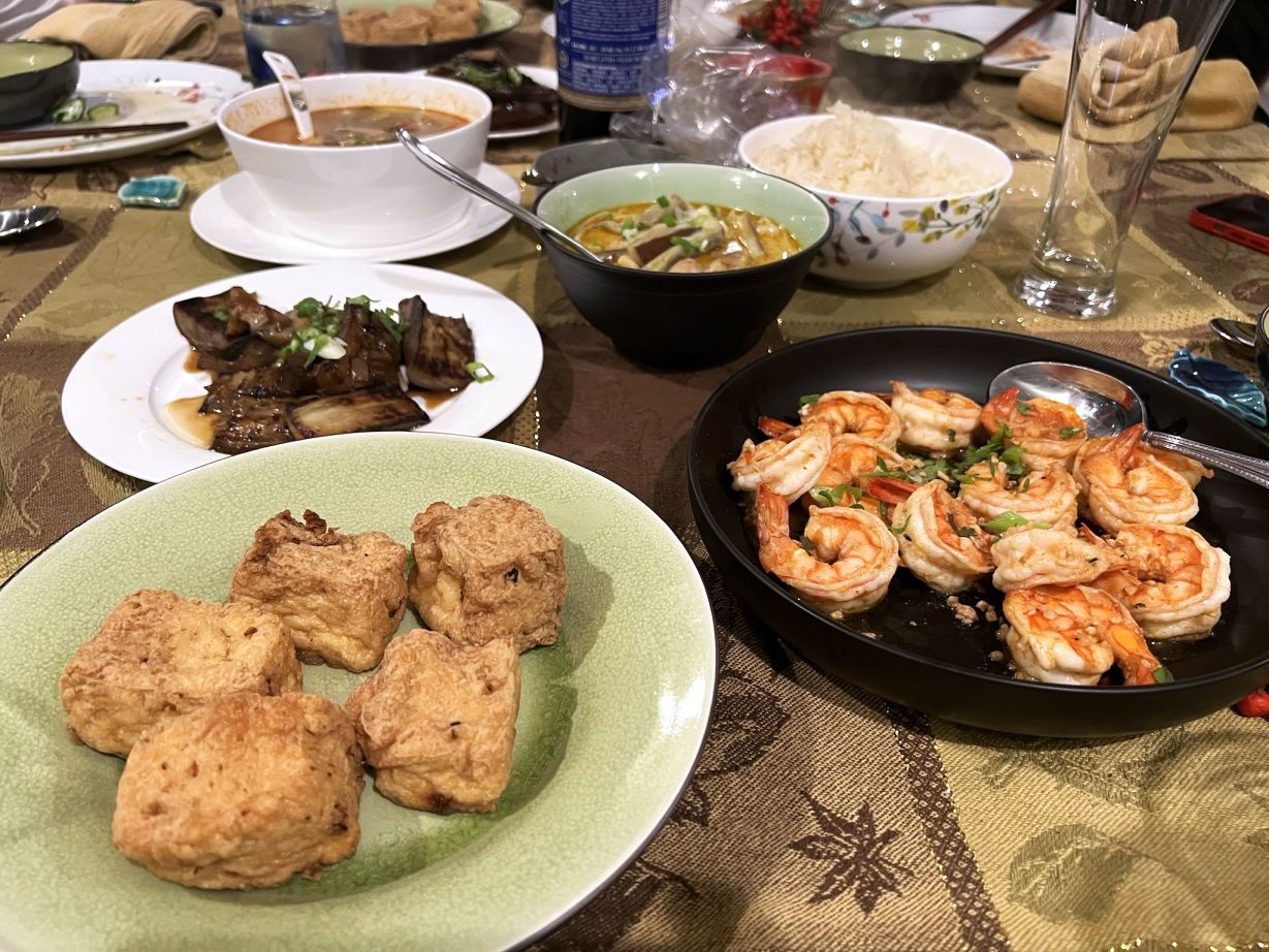 Crispy fried Tofu, Shrimps in garlic sauce, pan seared eggplant with soy sauce, Thai Chicken curry, Tom yum Kung, and sticky rice.