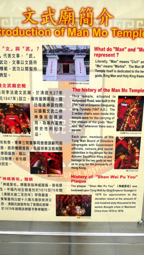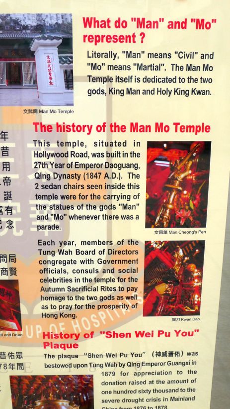 Man Mo Temple is a temple for the worship of the civil or literature god Man Tai /Man Cheong and the martial god Mo Tai /Kwan Tai. The two gods were popularly patronized by scholars and students seeking progress in their study or ranking in the civil examinations in the Ming and Qing dynasties.