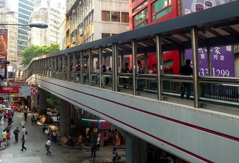 The Central–Mid-levels escalators in Hong Kong are the longest outdoor covered escalator system in the world. The entire system covers a distance of over 800 meters (2,600 ft) long with a vertical climb of 135 meters (443 ft). Constructed in 1993 to provide a better commute by linking areas within the Central and Western District on Hong Kong Island. It consists of twenty escalators and three moving side-walks. Listed in the Guinness World Records for the longest outdoor covered elevator system in the world.