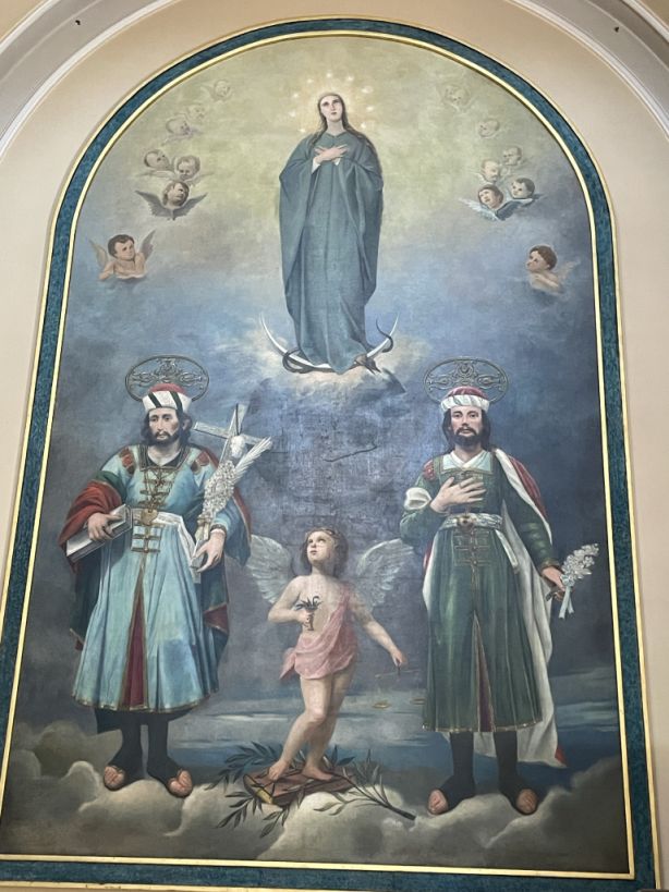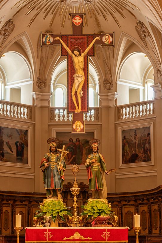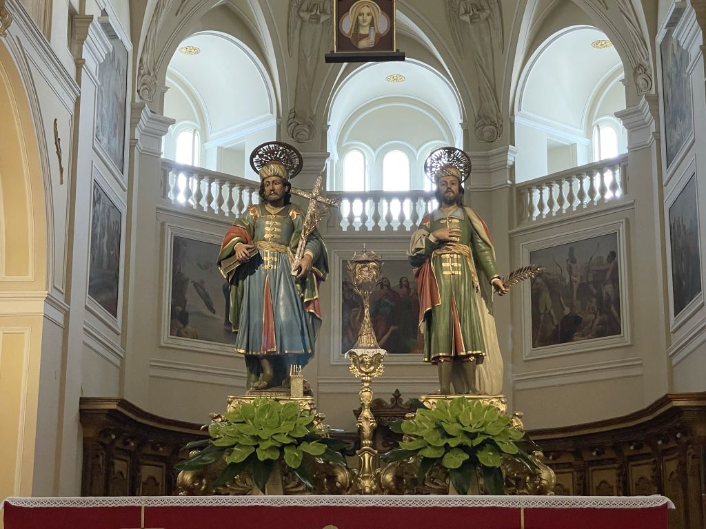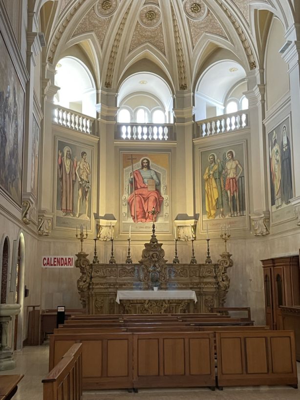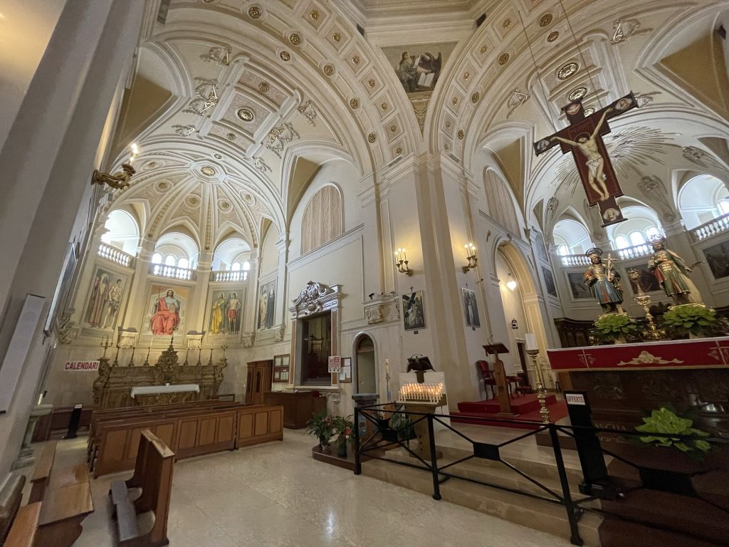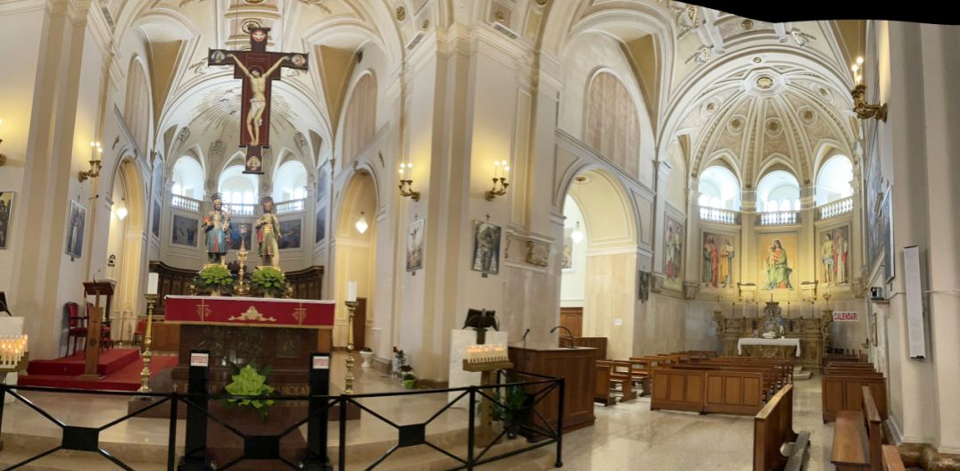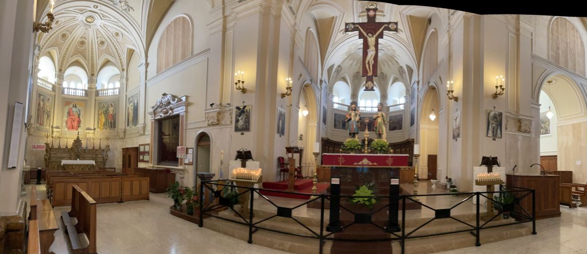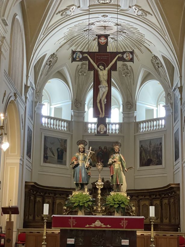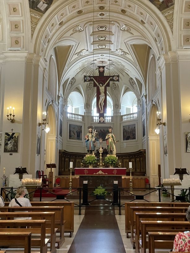 The main nave with the a sculpture of the crucifixion of the Christ is hang above and below two statues of Saints Cosmas and Damian.