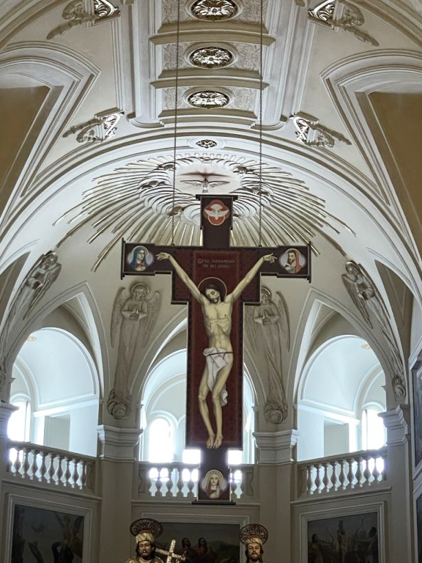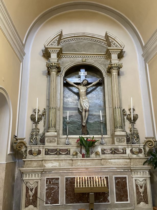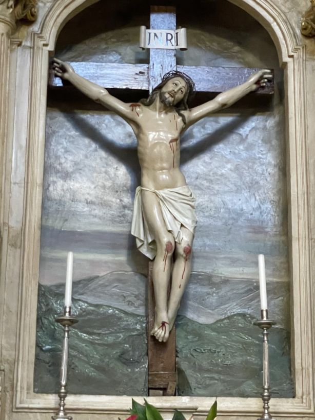 A sculpture of the crucifixion of the Christ on the side aisle on the basilica.