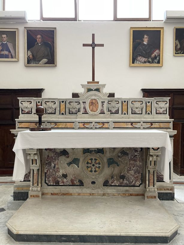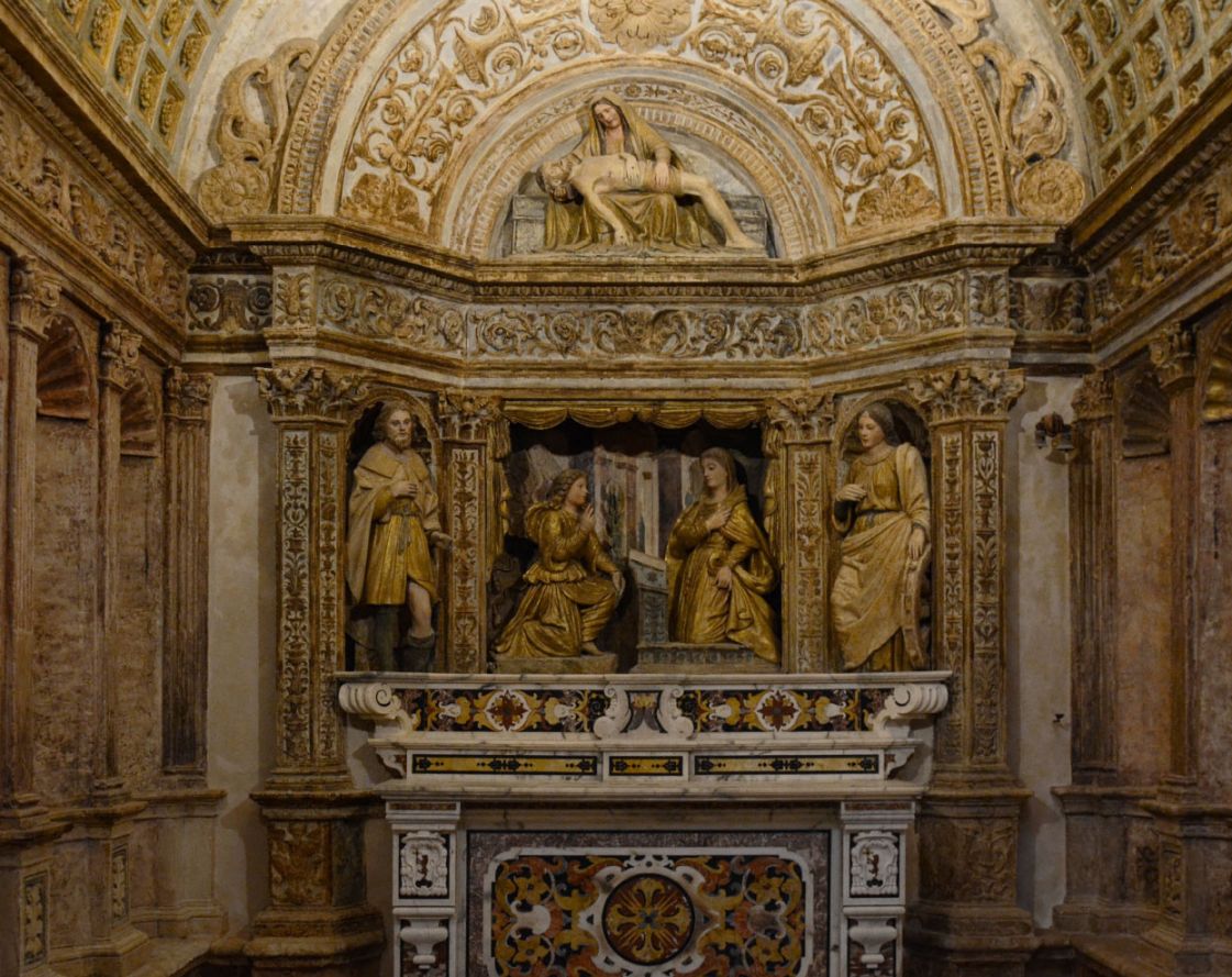 Coffered ceiling and niched wall that houses a statue of the virgin Mary and the Angel on the altar, flanked by Saint Roch and Catherine of Alexandria, and with a Pieta in the lunette above.