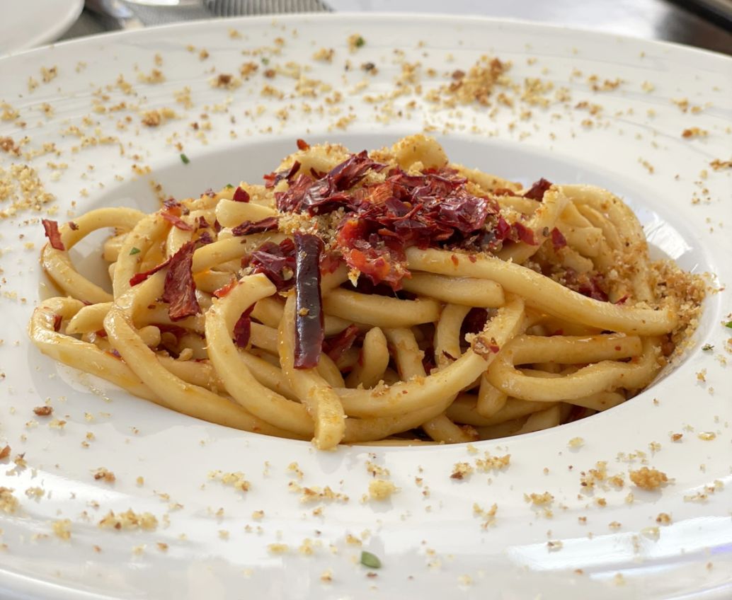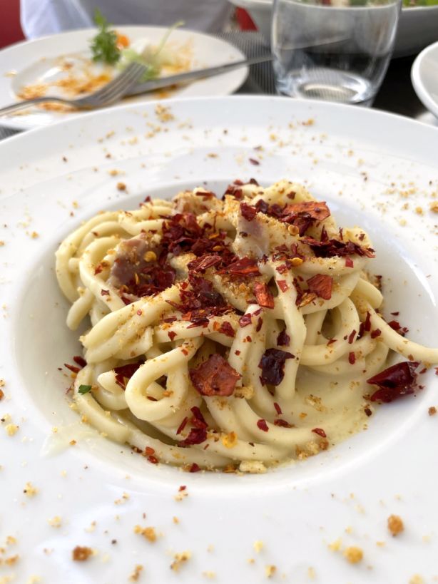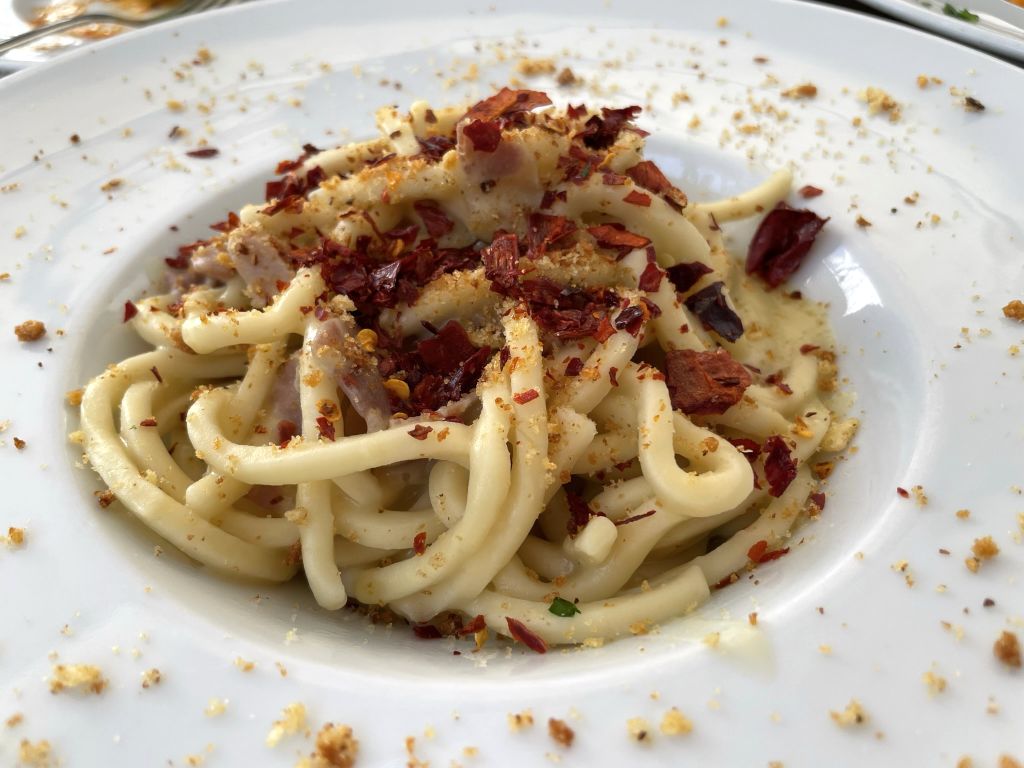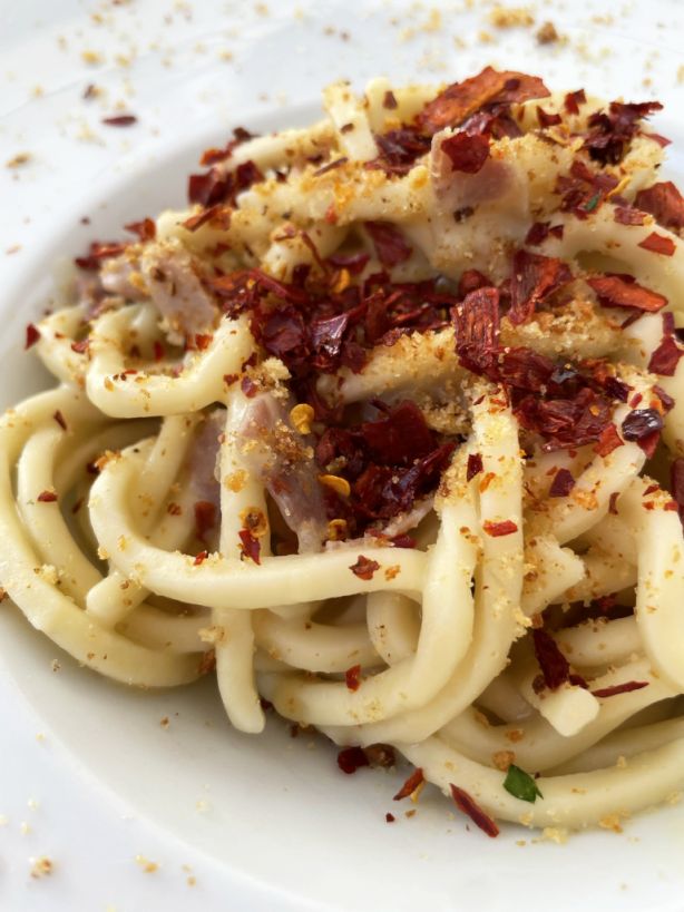 Spaghetti with broad bean cream, pork cheek, sweet peppers and fried breadcrumbs