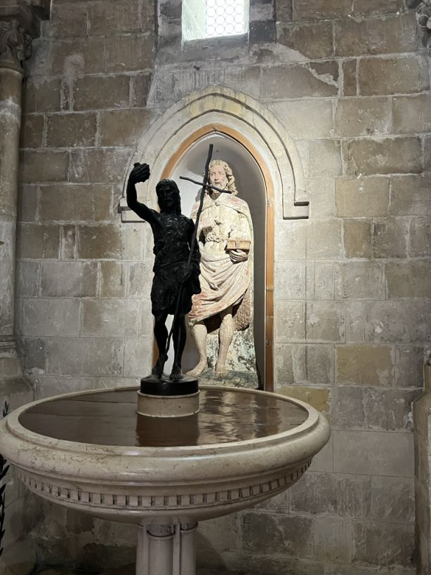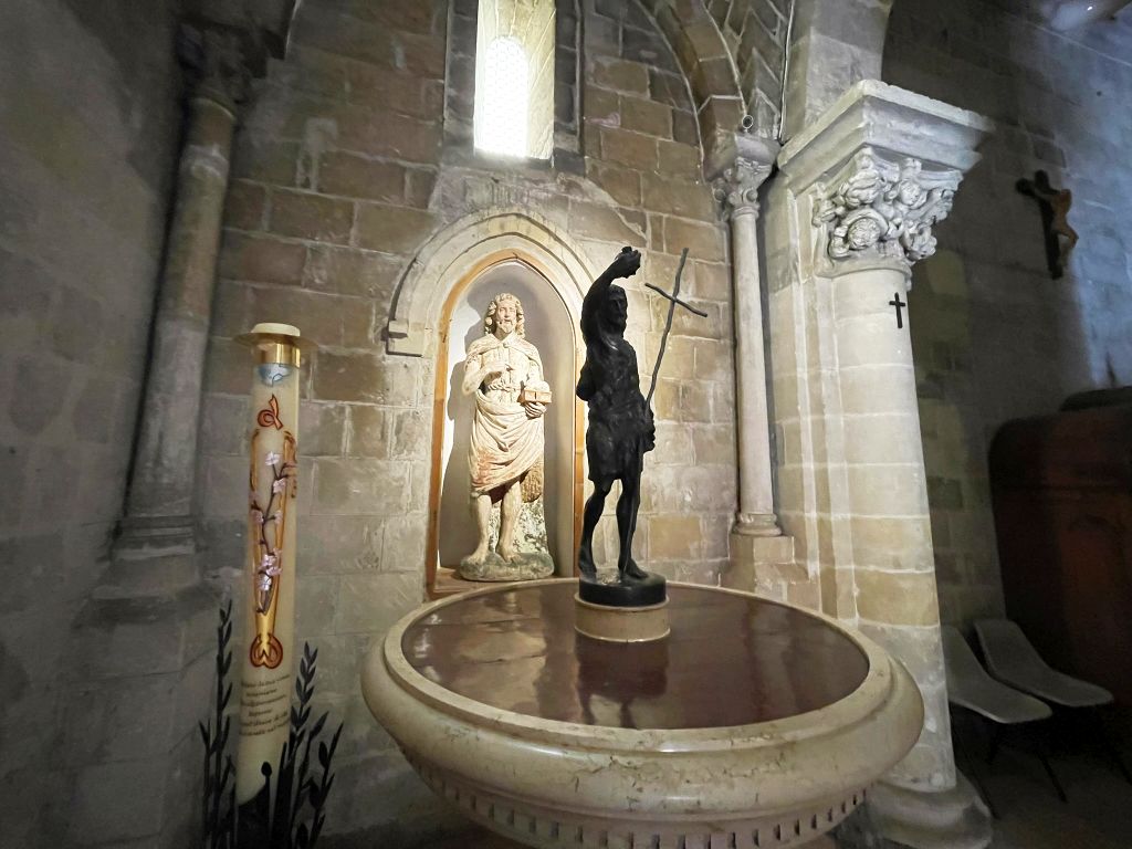 The portal is adorned with columns and animal sculptures. A work of tufa representing St. John the Baptist occupies the niche under the rose window.