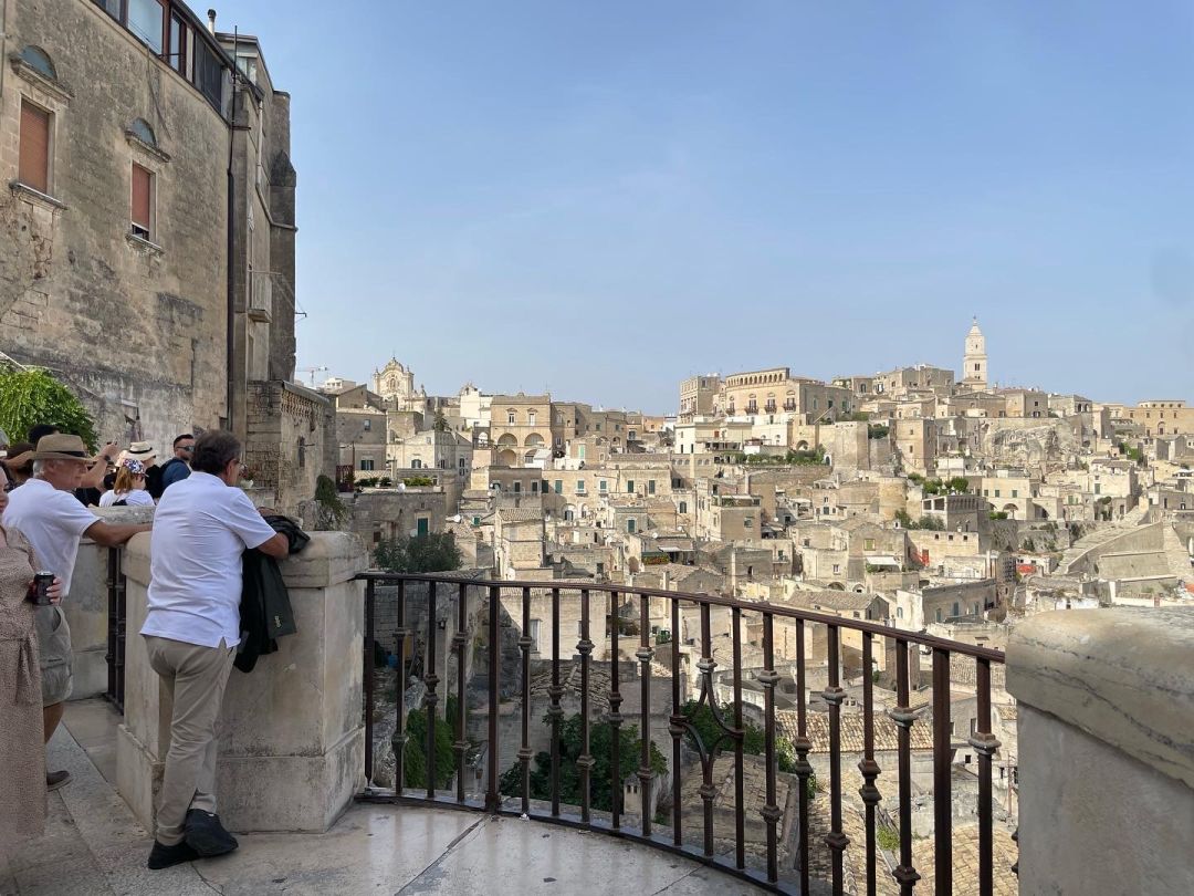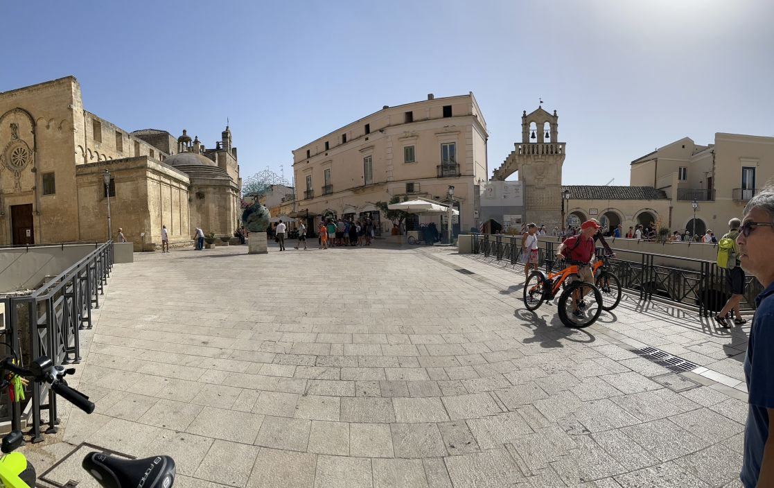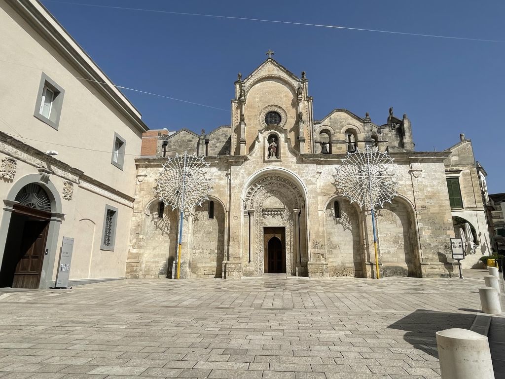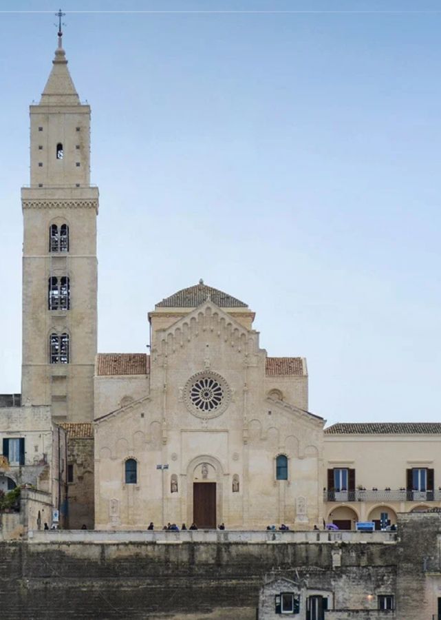 On the left is the Matera Cathedral view from across, you can see the balcony in front of the cathedral with people standing.
