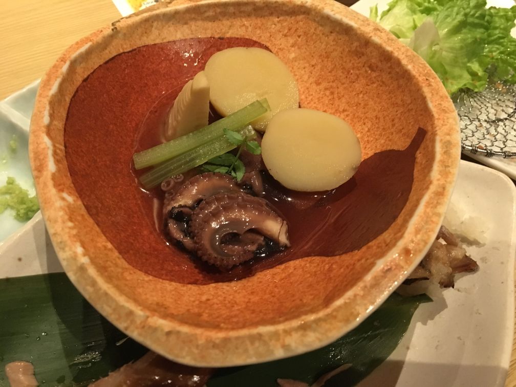 Cooked marinated octopus in dashi sauce.