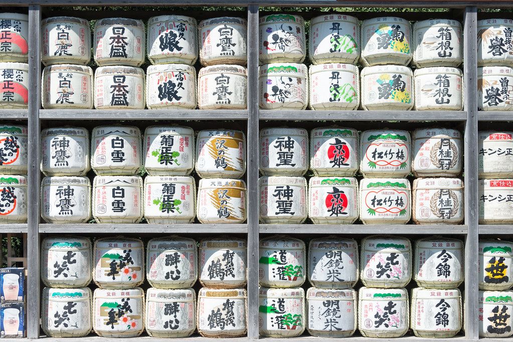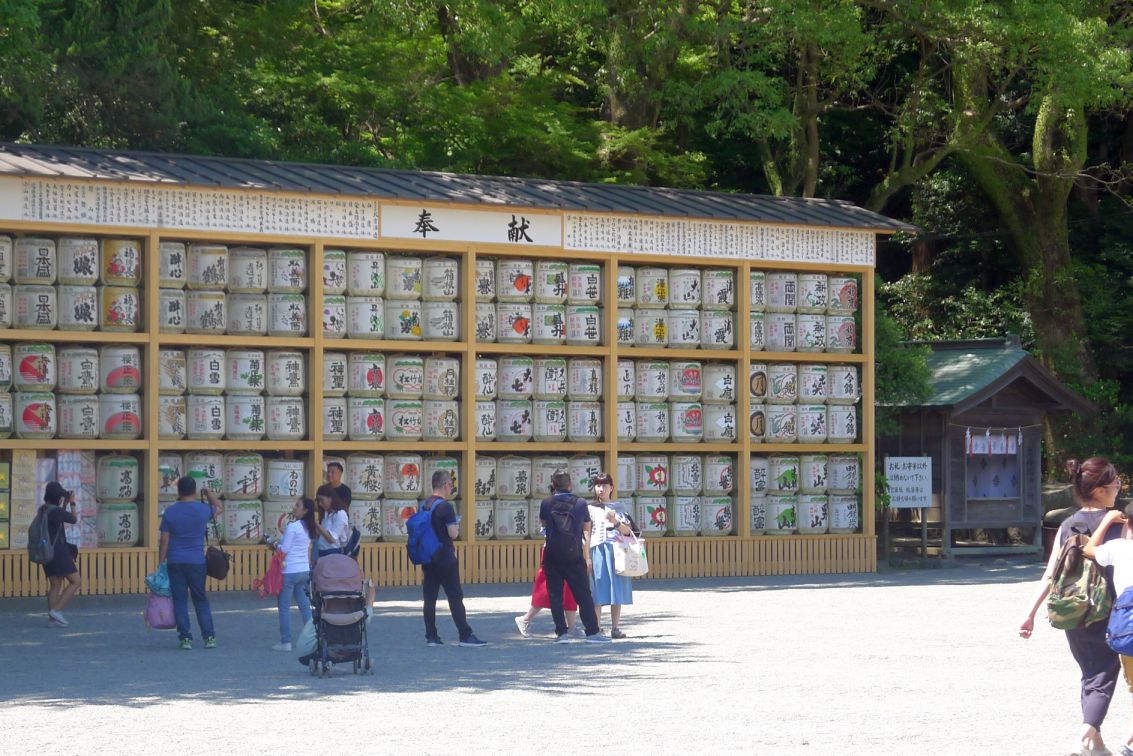 On the left hand side of the shrine you can see a large number of round empty barrels of sake stacked on top of each others.
