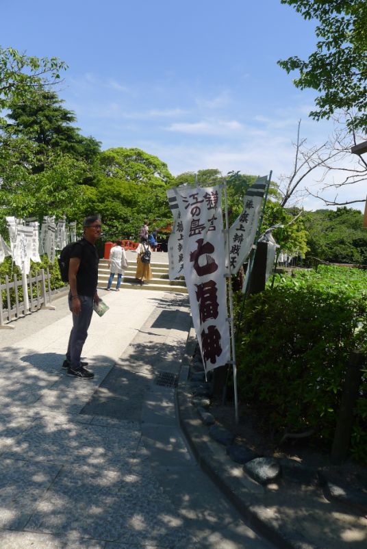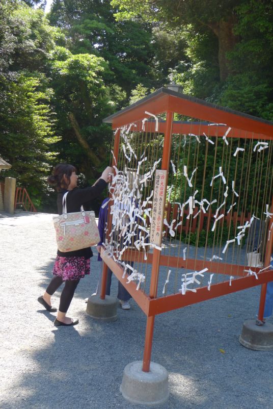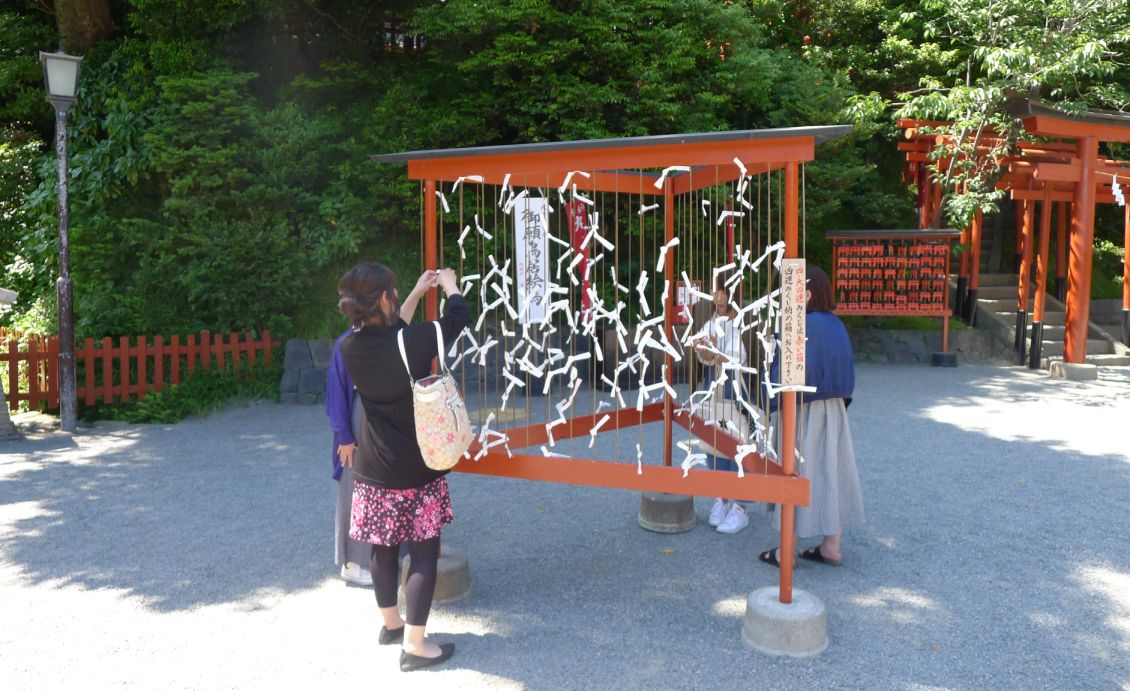 Many people offer prayers written on a white flag with two black lines. The design of these flags used to be the flag that the warriors of Yoritomo's army took into battle in 1180, identifying them as being members of Yoritomo's army. Yoritomo used this banner because his ancestor had used it when he suppressed the 1051 rebellion in the North-East Japan.