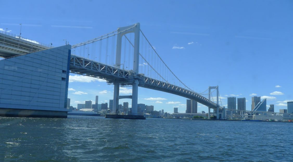 As we are getting close to the shore here is a better close up of the Rainbow bridge which is a suspension bridge .