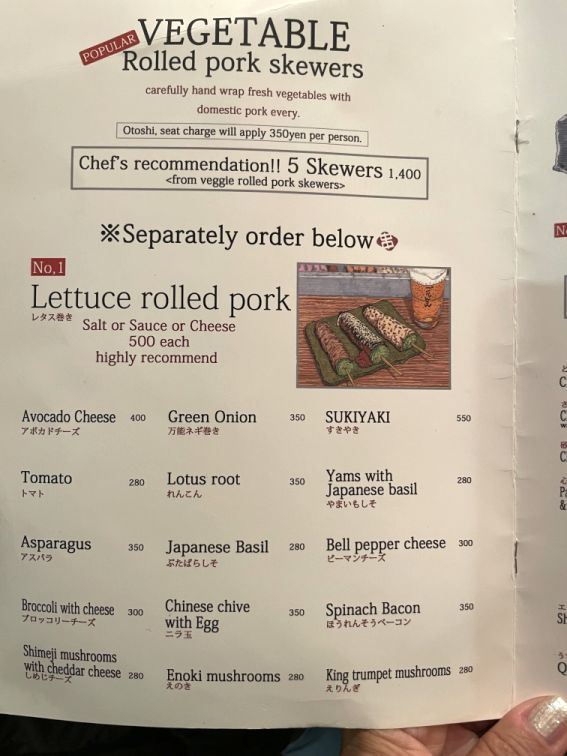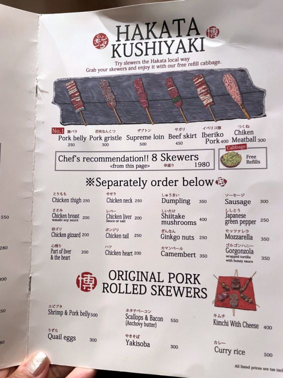 The main menu. We went with the Chef's recommendation for a total of 8 skewers per person to start.