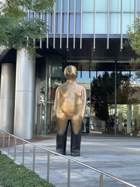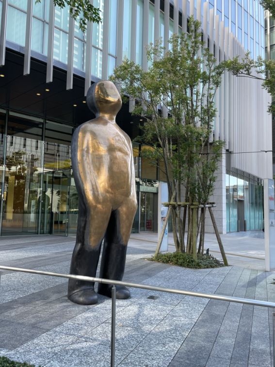 Modern bronze statue entitle 'Grow" (2012) by Ram Katzir (Dutch-Israeli sculptor) in front of the Yokohama Mitsui Building.