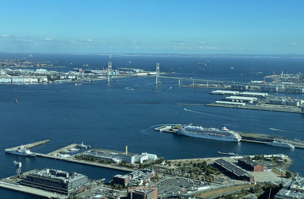 Yokohama bay with the Yokohama bay bridge in the distance.