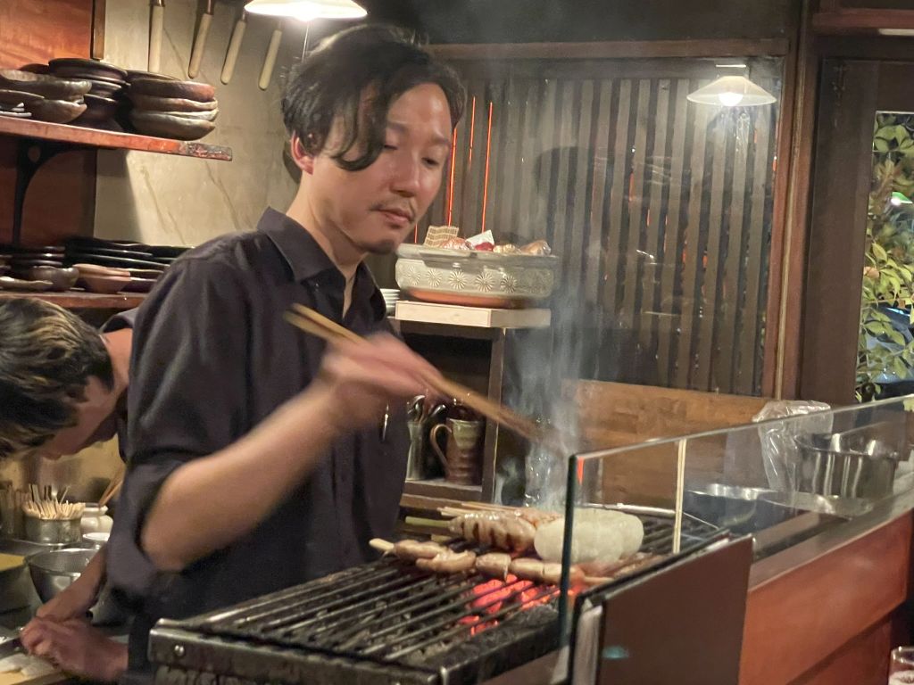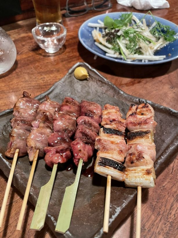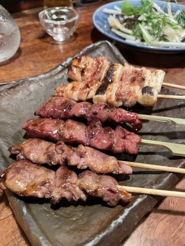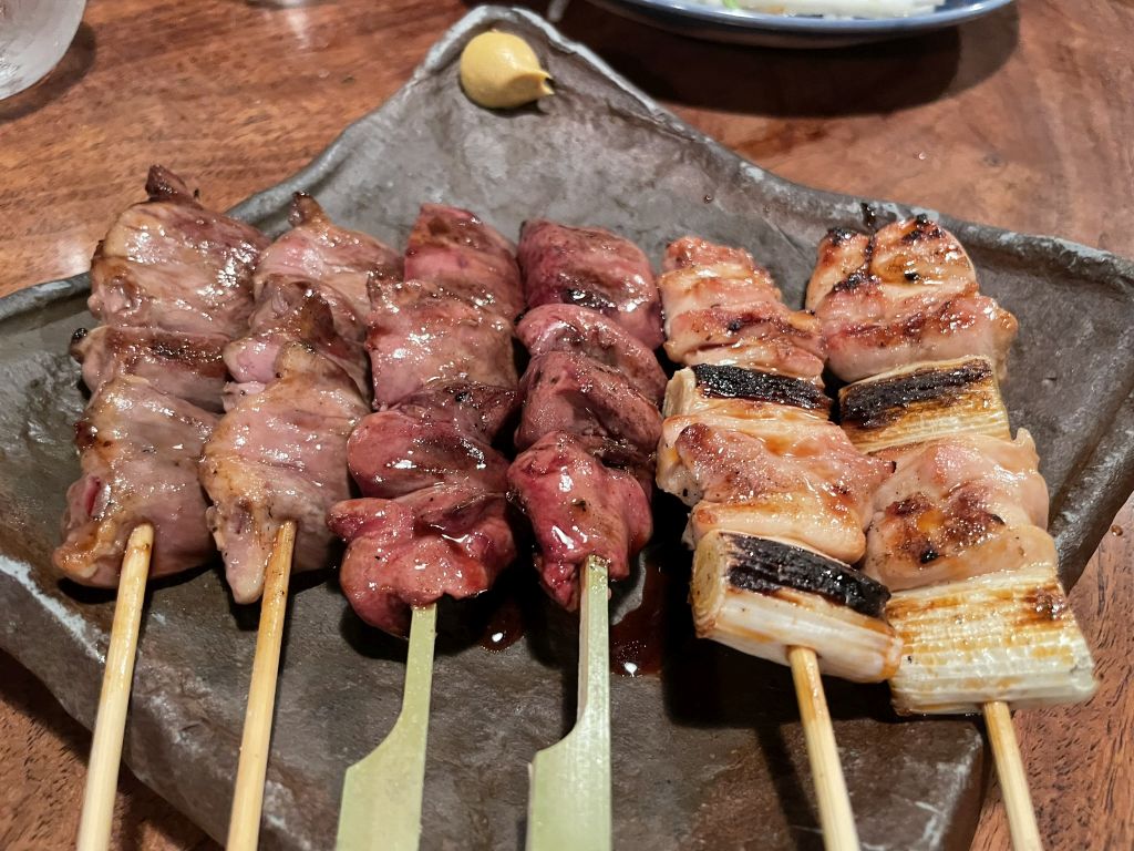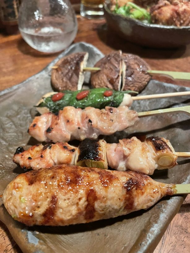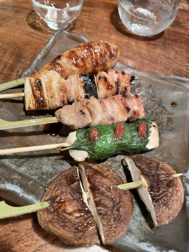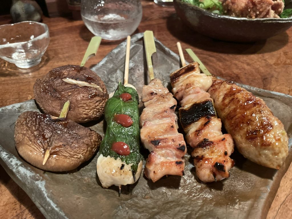 Shitake mushrooms, tender Chicken breast wrapped in shisho leave with plum sauce, leg with salt, and meatball with yakitori sauce