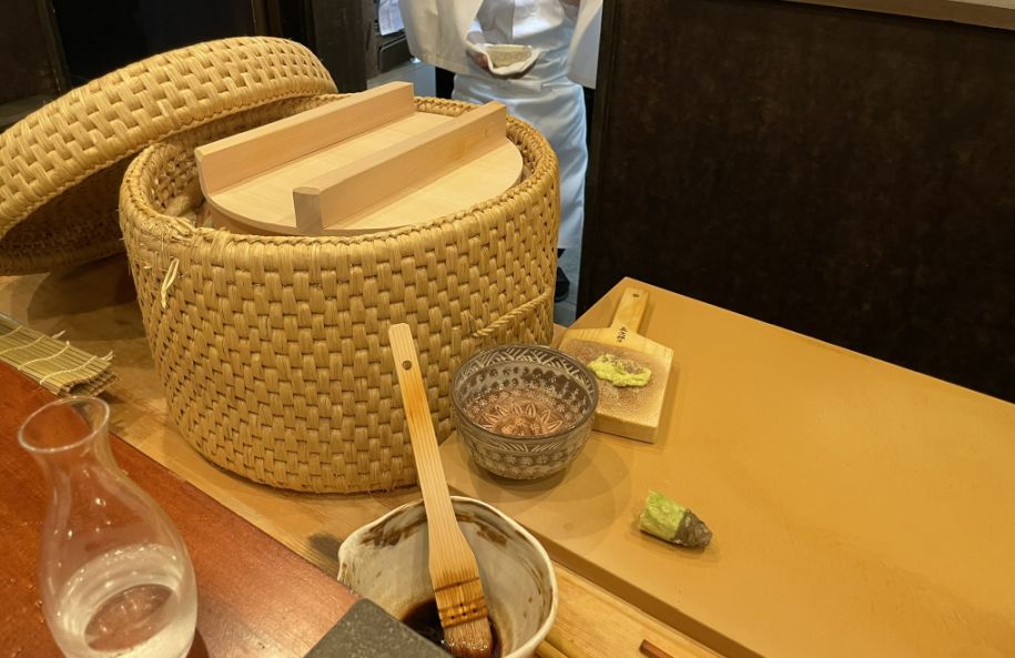 Sushi rice, soy sauce, and fresh wasahi behind the counter.