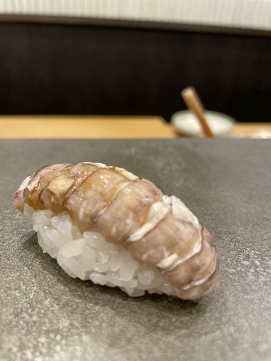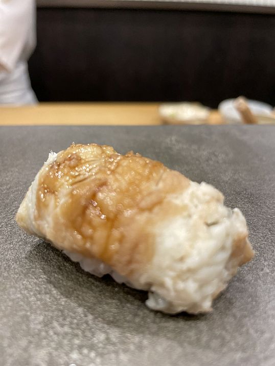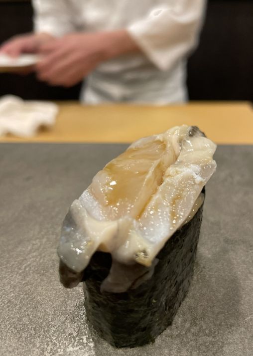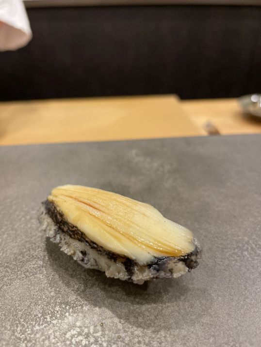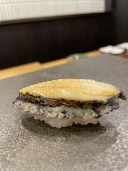 The 3rd sushi is an abalone that is also brushed with soy sauce. Firm and chewy in a pleasant way, with a deep ocean flavor. The soy sauce added richness, turning something simple into something earthy and satisfying.