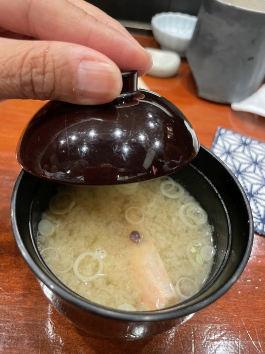 Then came a final bowl of miso soup, warm and fragrant, with scallions floating on the surface and the shrimp head tucked inside, deepening the broth with its rich aroma.