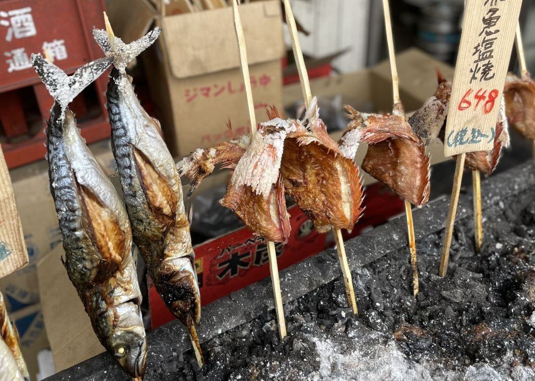 When we stepped back outside, the air changed again, this time filled with the smoky, savory smell of grilling seafood. Near the walkway stood a simple metal BBQ grill, where whole fish were skewered on sticks and lined up over hot coals. Their skins slowly blistered and browned, fat dripping onto the fire with a soft crackling sound.