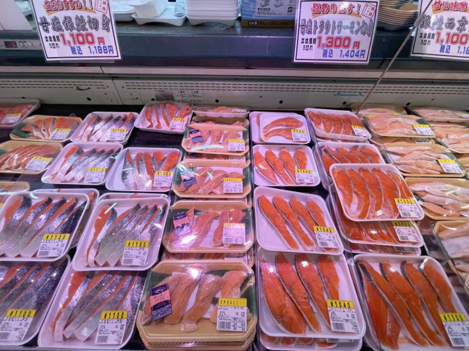 A stall with rows of fresh salmon, already sliced into thick, perfect cuts, their silver skin still shining along the edges. They were neatly packed in clear trays, the orange flesh glowing under the lights, so clean and fresh it almost looked unreal.