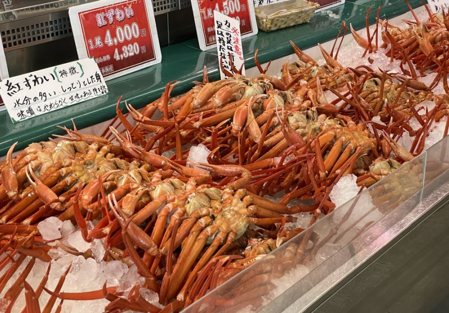 Another stall displayed piles of snow crabs, their shells glowing in shades of deep red and orange, stacked high like something from a painting. Their long legs were spread wide, glossy and bright, making the whole display impossible to ignore.