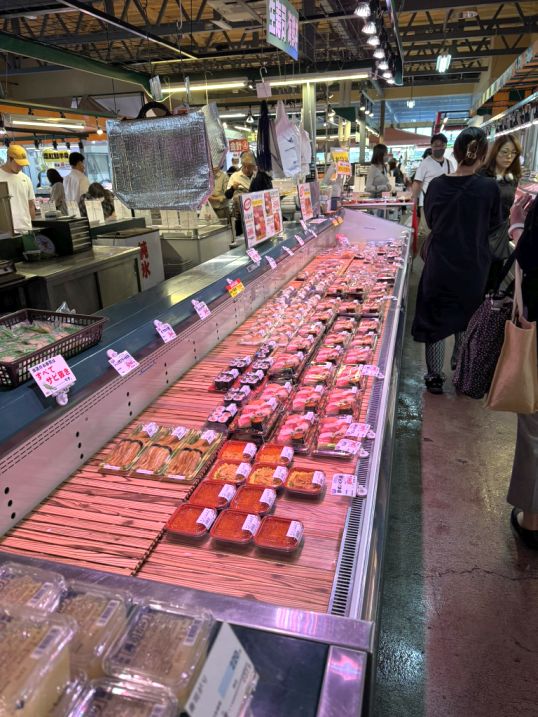 All the seafood was prepared with such care, wrapped and labeled, waiting to be taken home or enjoyed right away. It felt very different from a supermarket back home; this was seafood at its source, just hours from the water. Watching locals choose their trays and vendors restock the ice, I could really feel how deeply seafood is woven into everyday life here in Niigata.