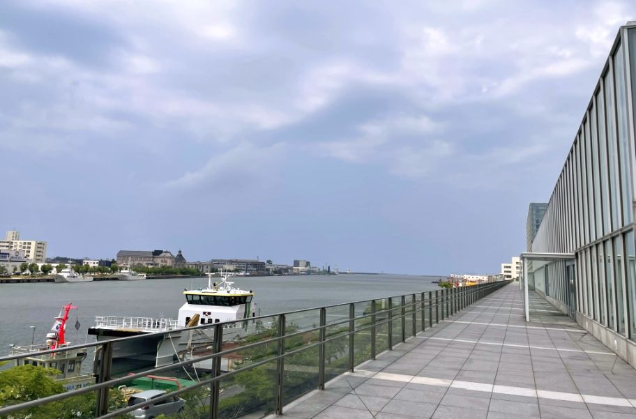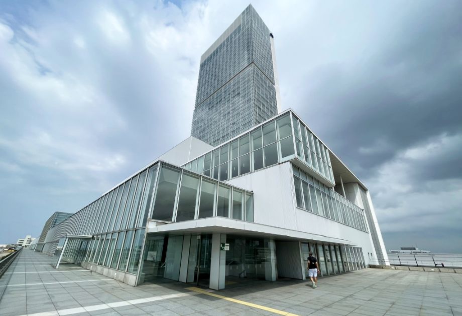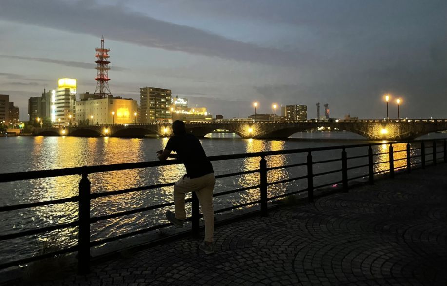 As we came closer to Hotel Nikko Niigata, the riverfront path widened into a long, neatly paved walkway. A low metal railing ran alongside it, separating the promenade from the water below. On the other side rose the base of the hotel, a long stretch of floor-to-ceiling glass windows that glowed softly from the lights inside, like a bright ribbon along the river’s edge.
