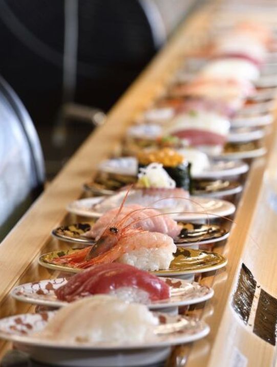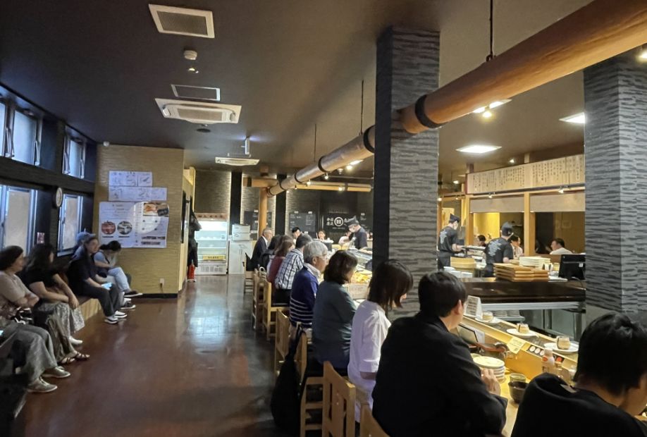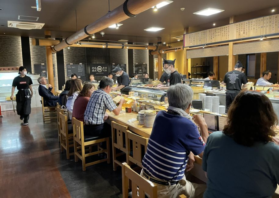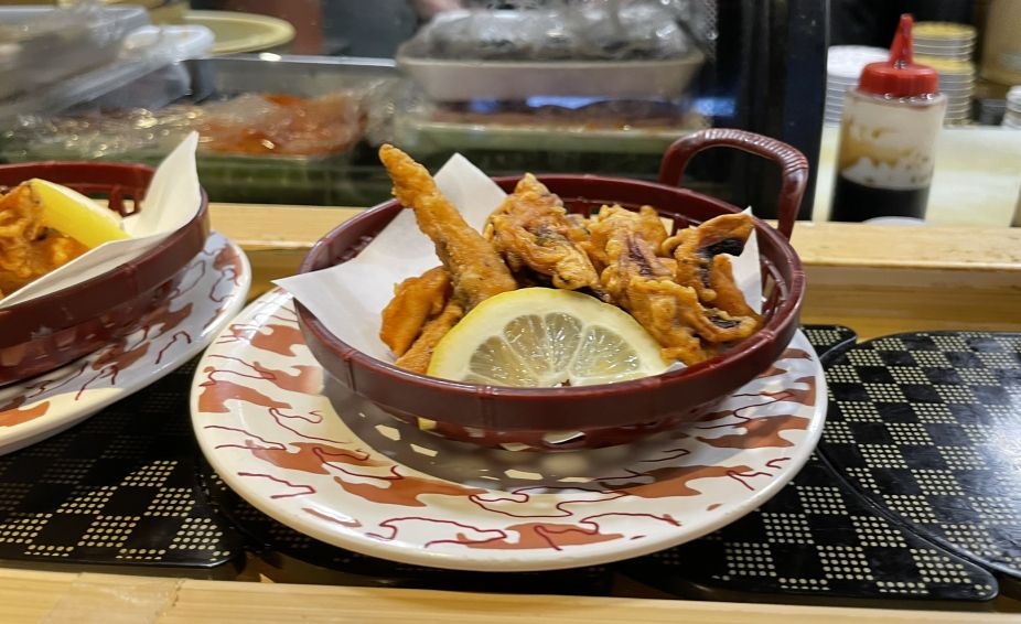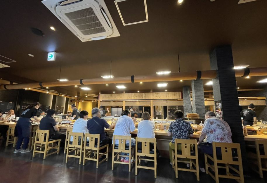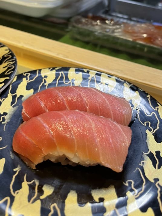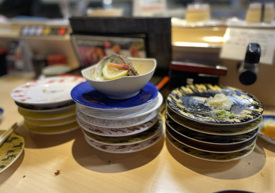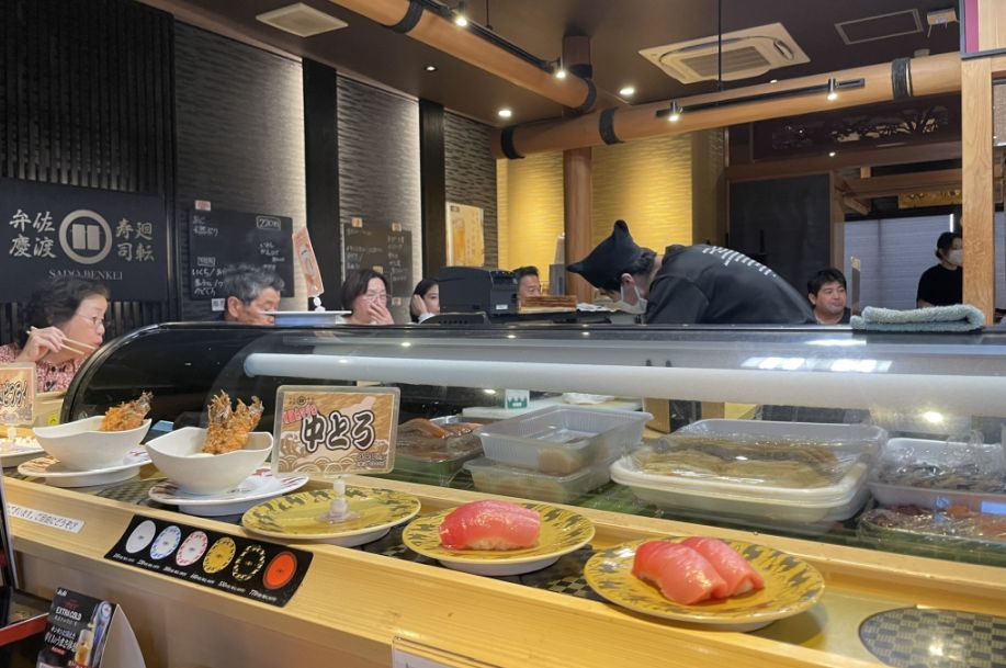 What surprised us most was how fast everything moved. In the U.S., conveyor-belt sushi often feels slow, with plates sitting too long before anyone takes them. But here, it was completely different. The dishes barely had time to circle the counter before someone reached out and grabbed them. Plates disappeared almost as soon as they appeared, replaced instantly by new ones.