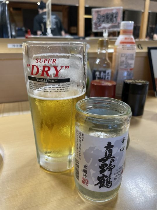 Cold beer and sake for Hoa and in front of us the conveyor belt with so many dishes to choose from.