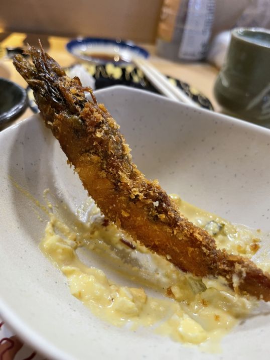 The hot, crispy shrimp tempura was light and crispy and then we had some type of braised fish.
