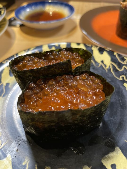 As we walked in, the first thing we noticed was the long counter facing a wide conveyor belt, with rows of chefs working quickly and quietly behind it. We were seated right at the counter, close enough to see every movement of their hands. Plates of sushi streamed past us in a steady rhythm, , salmon, shrimp, gleaming in neat rows, one after another.