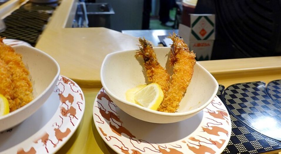 We crab the crispy pan fried shrimp on the conveyer belt.
