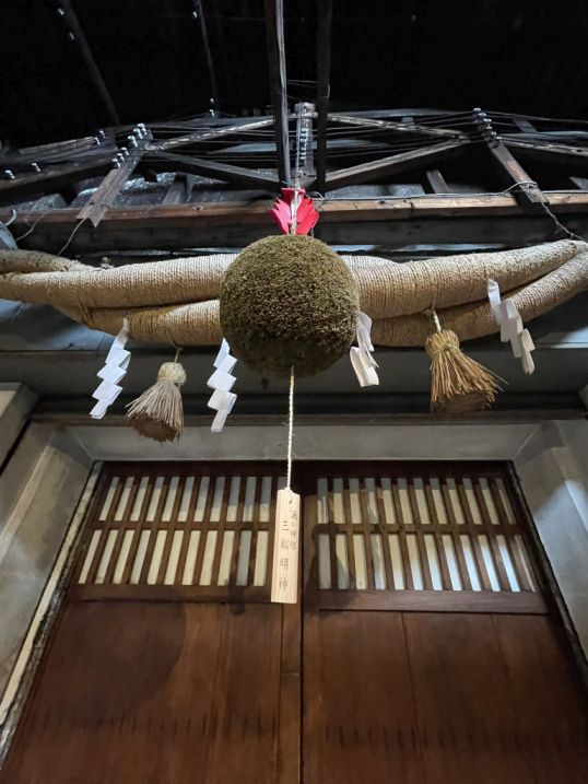 This straw ball is a sugidama, traditionally made from cedar branches (sometimes it looks like straw once dried), tightly bound into a large sphere and hung at the entrance of a sake brewery or inside important brewing rooms. When it is first made, it is bright green (Green sugidama → fresh sake has just been made). Over time, it slowly dries and turns brown (Brown sugidama → the sake has aged and matured). It is a symbol of new sake being brewed.