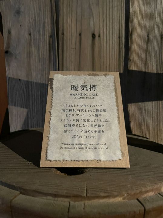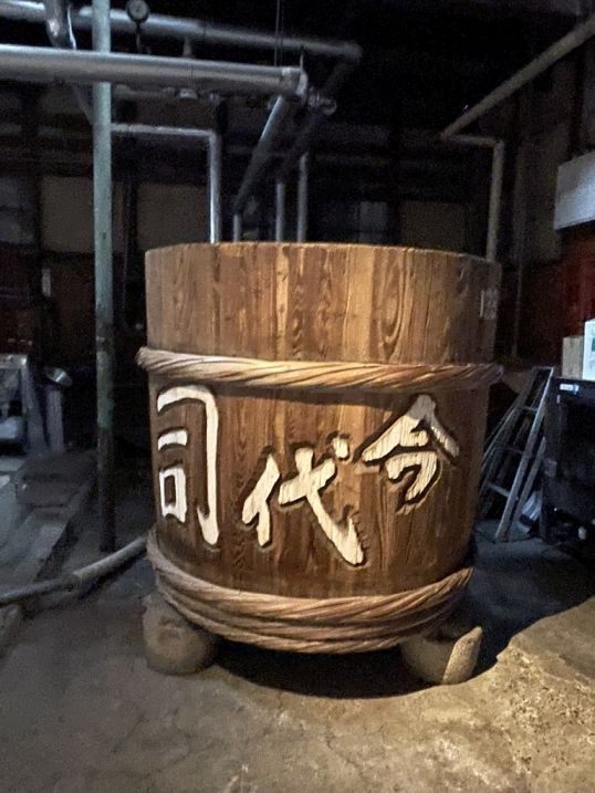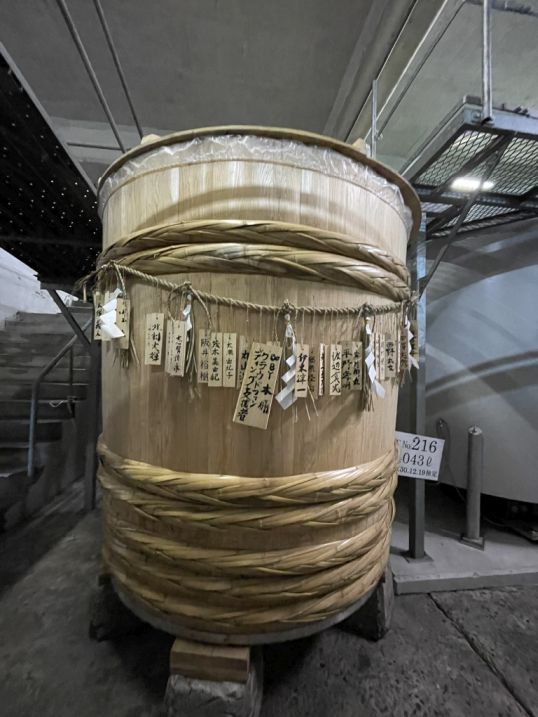In the center stood an enormous wooden container, its surface marked with bold Japanese characters that looked hand-brushed and ceremonial. Nearby, along one side of the room, was a raised cement platform with a perfectly circular opening, covered by a thick wooden lid. It felt mysterious and ancient, like a quiet reminder of how sake had been made long before modern equipment existed.