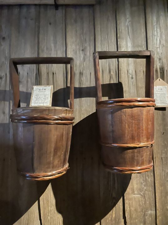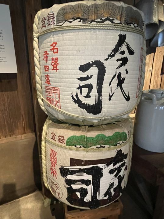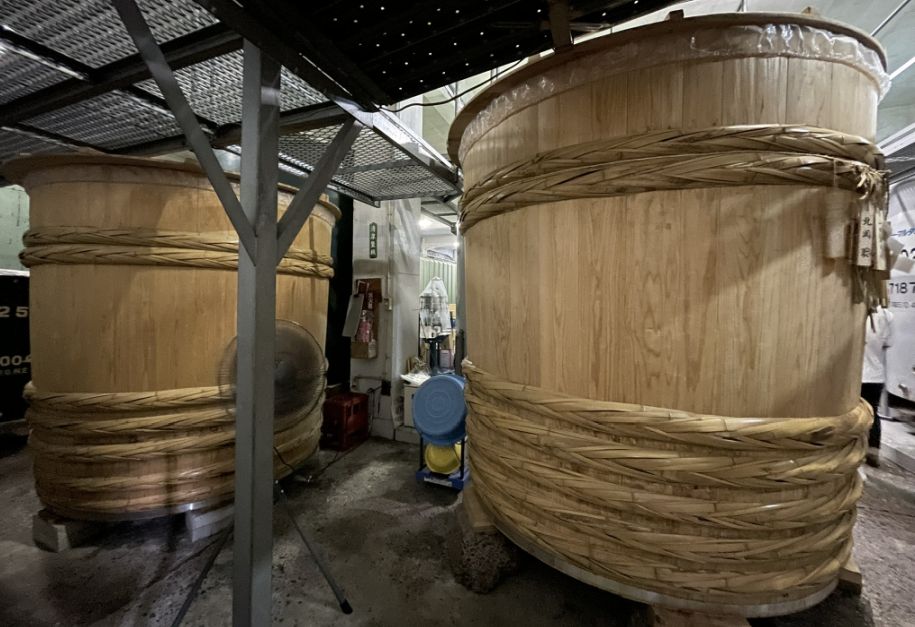 These massive wooden container are traditional sake fermentation and storage tanks, called kioke.