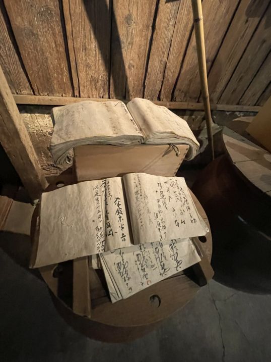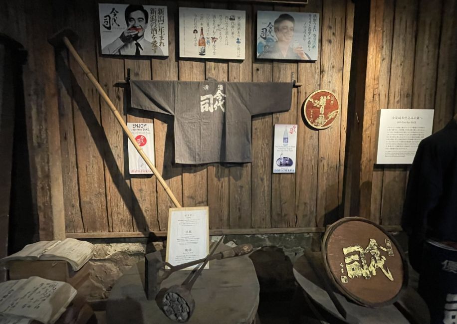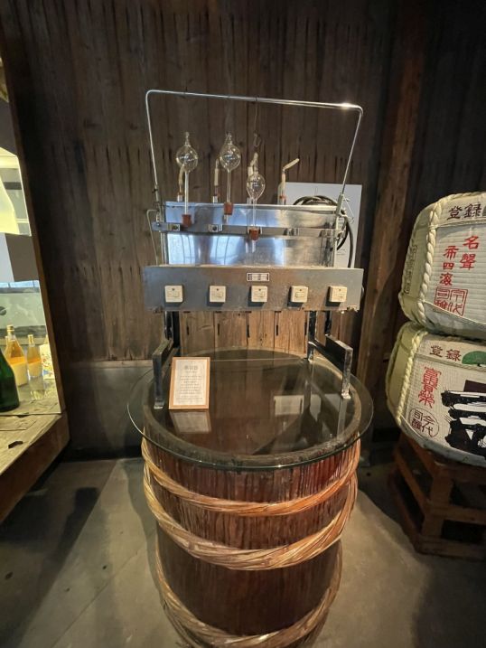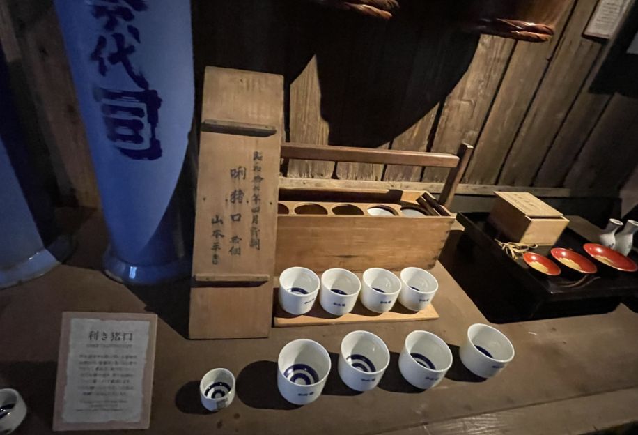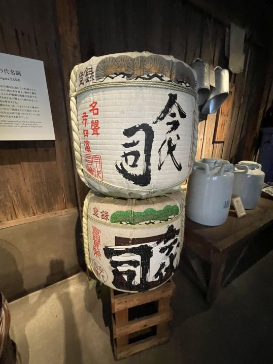 In one corner on display is a traditional navy-blue work clothes, dyed deep indigo and printed with crisp white Japanese lettering across the collard and the apron. These were the uniforms of the brewery workers, simple and practical, yet strikingly beautiful in their own way. Seeing them made the history feel personal, as if the people who brewed, carried, stamped, and sold the sake were still quietly present in the room.