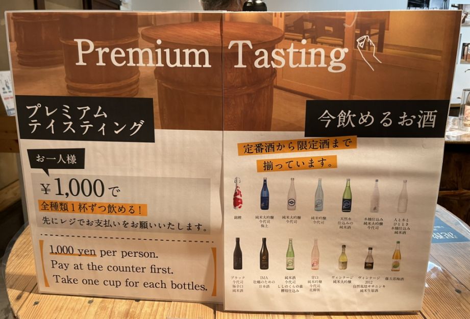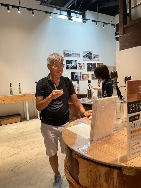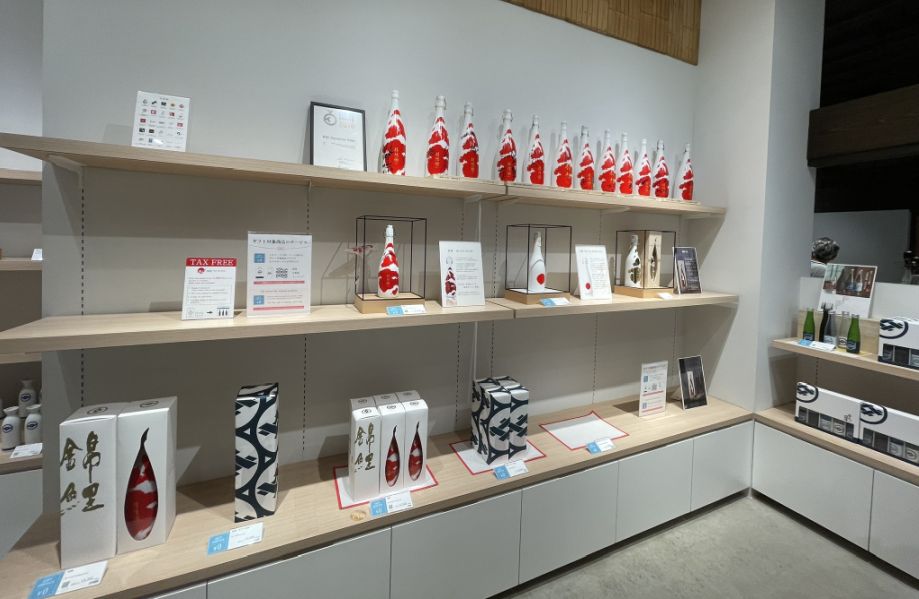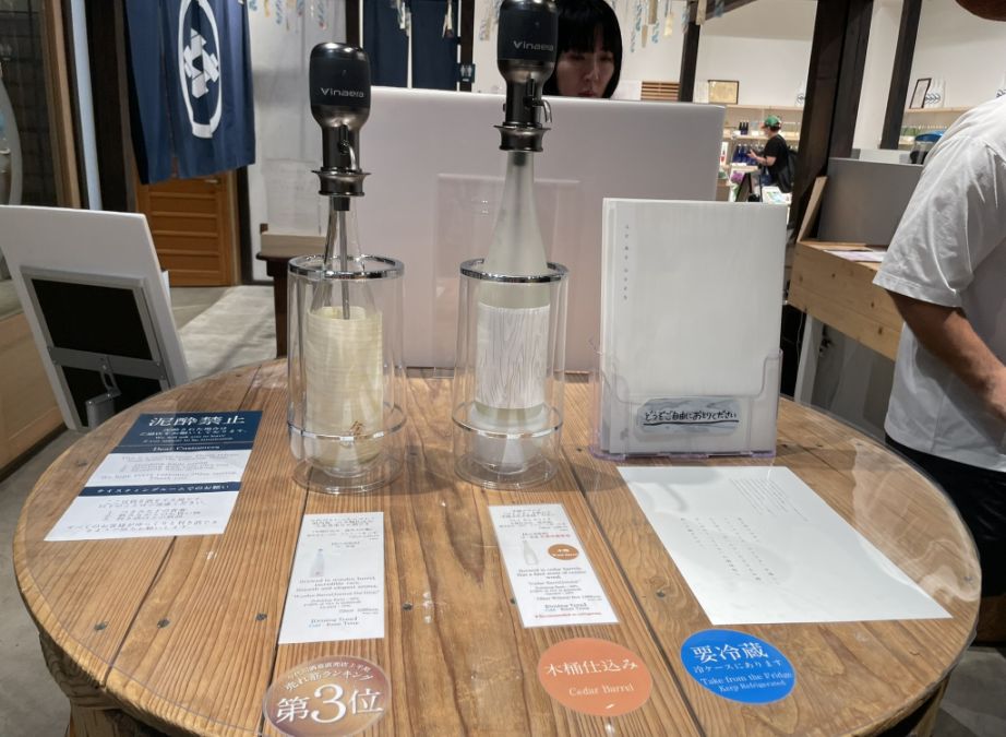 The tasting room was lined with rows of sake bottles, each one different in shape, label, and color. Some were simple and modern, others decorated with elegant calligraphy or soft illustrations, hinting at the character of what was inside.