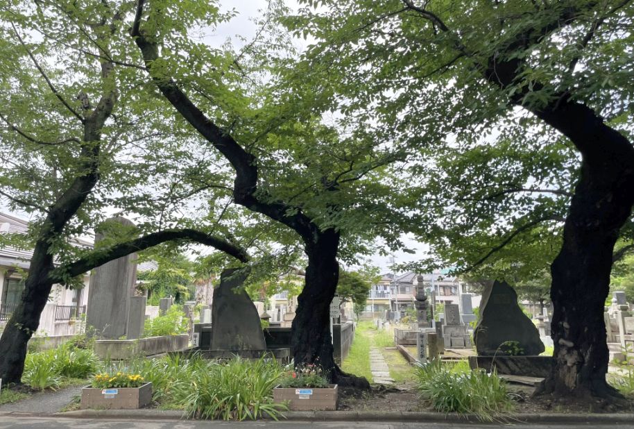 In Japanese tradition, large trees are often seen as dwellings for spirits or guardians of the land, adding to the sacred feeling of the cemetery.