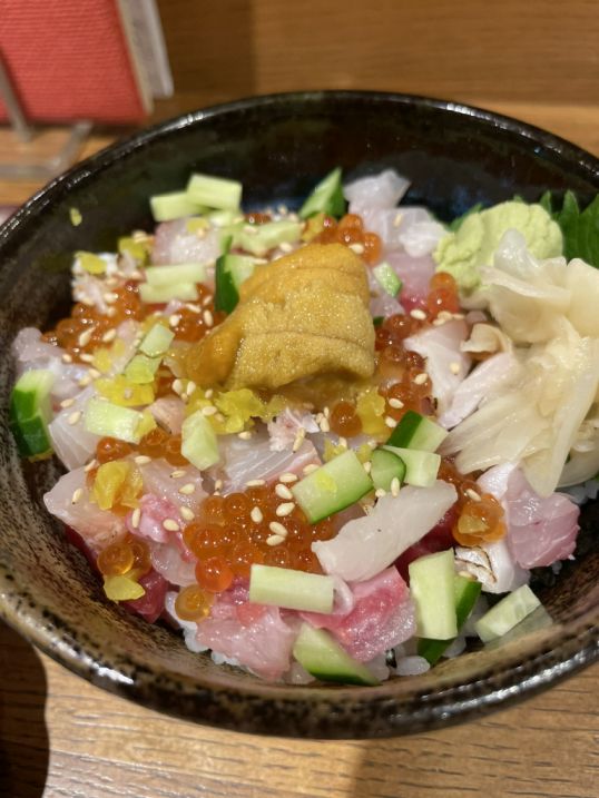 Then arrived a beautiful sashimi rice bowl, a mound of warm rice completely covered with glistening slices of raw fish, more uni on top, and a scattering of cucumber and sesame seeds. The combination of cool fish and warm rice, creamy sea urchin and crunchy cucumber, was simple but unforgettable.