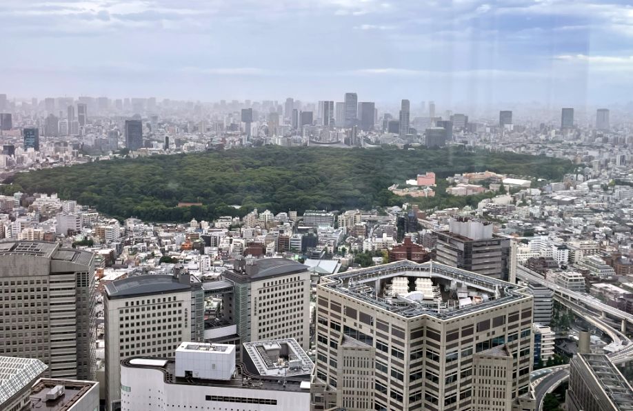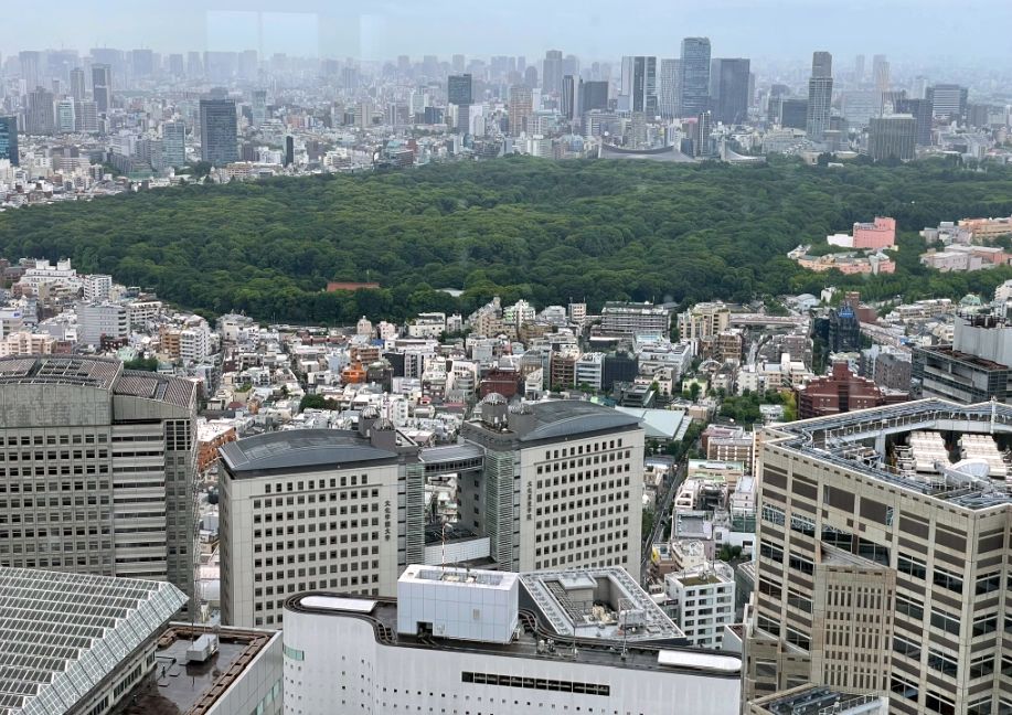 From the windows, we could clearly pick out Yoyogi Park, a wide patch of deep green surrounded by a dense ring of buildings. From above, it looked like a quiet island of trees floating in a gray ocean of concrete and glass. Paths curved gently through the canopy, and the open lawns appeared like soft brushstrokes between darker clusters of forest.